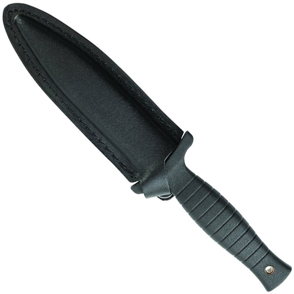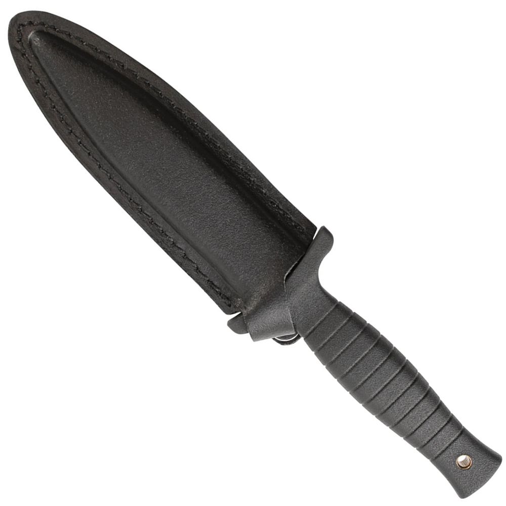 The Smith & Wesson H.R.T. is a full tang fixed knife, weighing approximately 0.5 lbs. It has a black 7Cr17 high carbon stainless steel blade made of 7Cr17 carbon steel. The shape is spear point with false edge and blood groove. Handle is wrapped in rubber for a strong grip. Leather belt/boot sheath included.