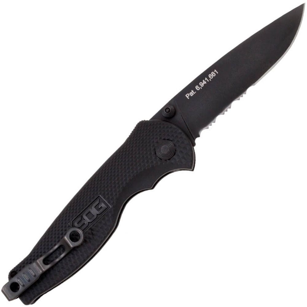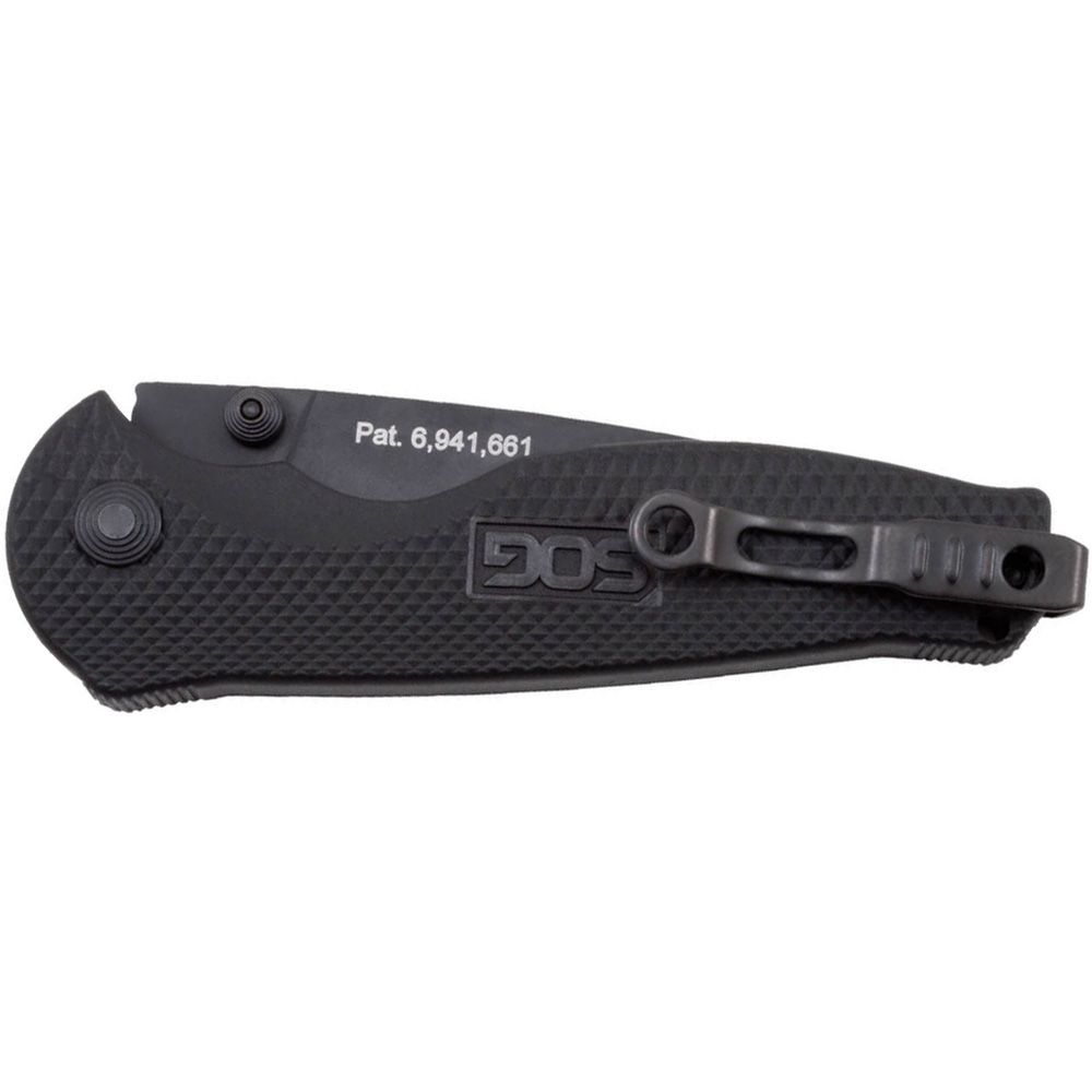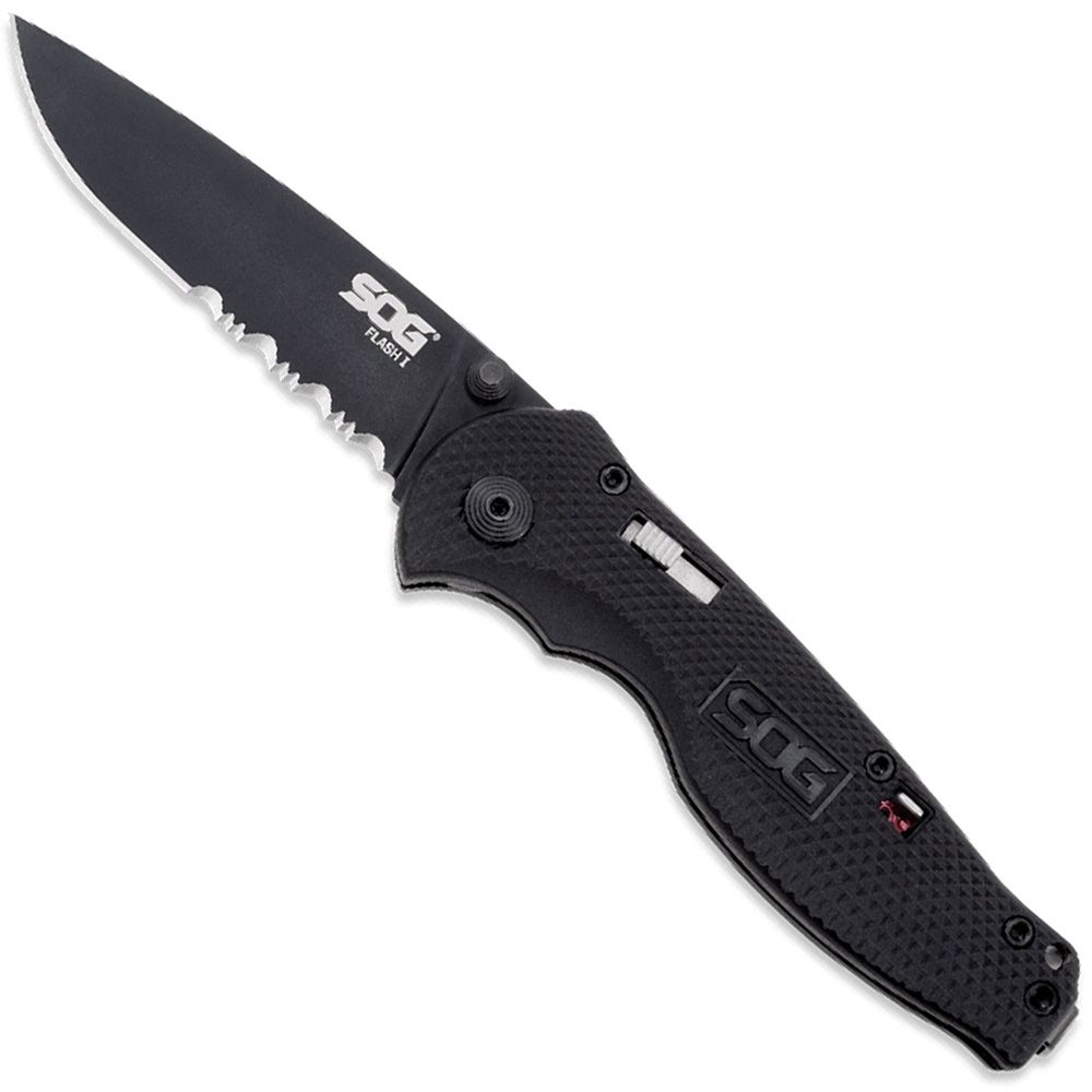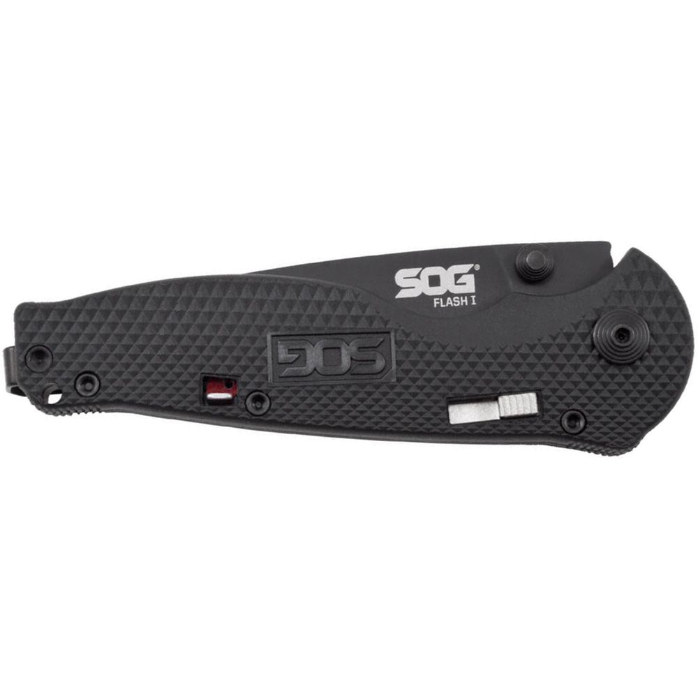 The Flash I (Black TiNi) comes with glass-reinforced nylon (GRN) handle and black TiNi coated 1/2 serrated blade. All Flash knives come standard with SOG's patent pending, reversible bayonet mounted clip that ensures the lowest, most discreet carry possible. We also had the foresight to incorporate an additional safety lock that gives added security when the blade is closed.