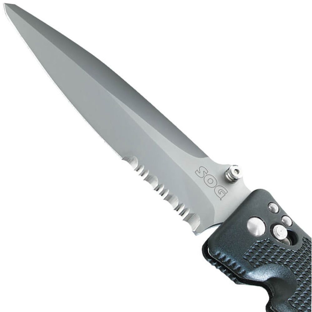 A folding version of the Pentagon, the Pentagon Elite has all the benefits of its big brother as well as a bead blasted blade that reduces reflection. The stainless steel blade offers the instant choice between a serrated or beveled edge, giving you the best of both worlds for cutting virtually any material. Extremely lightweight, the Pentagon Elite features a glass-reinforced GRN handle with stainless steel liners that provides sensational feel and balance. Tested at over 1000 lbs. of force at the lock, the Arc-Lock is SOG’s strongest lock. It can be carried conveniently with its reversible low-carry pocket clip.