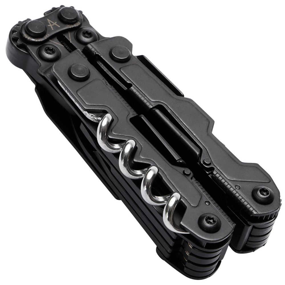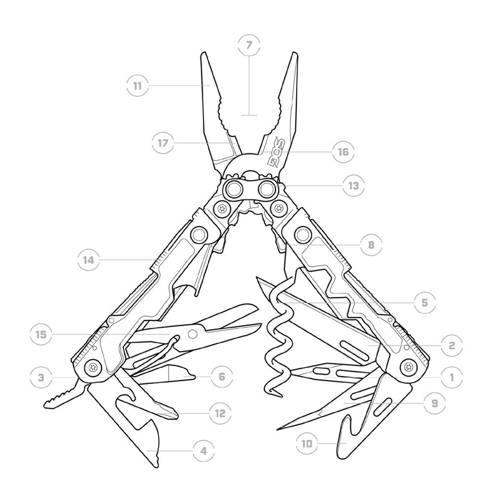 Tools Count: 1. Awl 2. Blade (Straight Edge) 3. Bottle Opener 4. Can Opener 5. Compound Leverage Corkscrew 6. Flat Screwdriver (Small) 7. Gripper 8. Hex Bit Driver (1/4") 9. Jewelry Driver 10. Line Cutter 11. Needle Nose Pliers 12. Phillips Screwdriver 13. Protractor 14. Ruler 15. Scissors 16. Wire Cutter (Hard) 17. Wire Cutter (Soft).