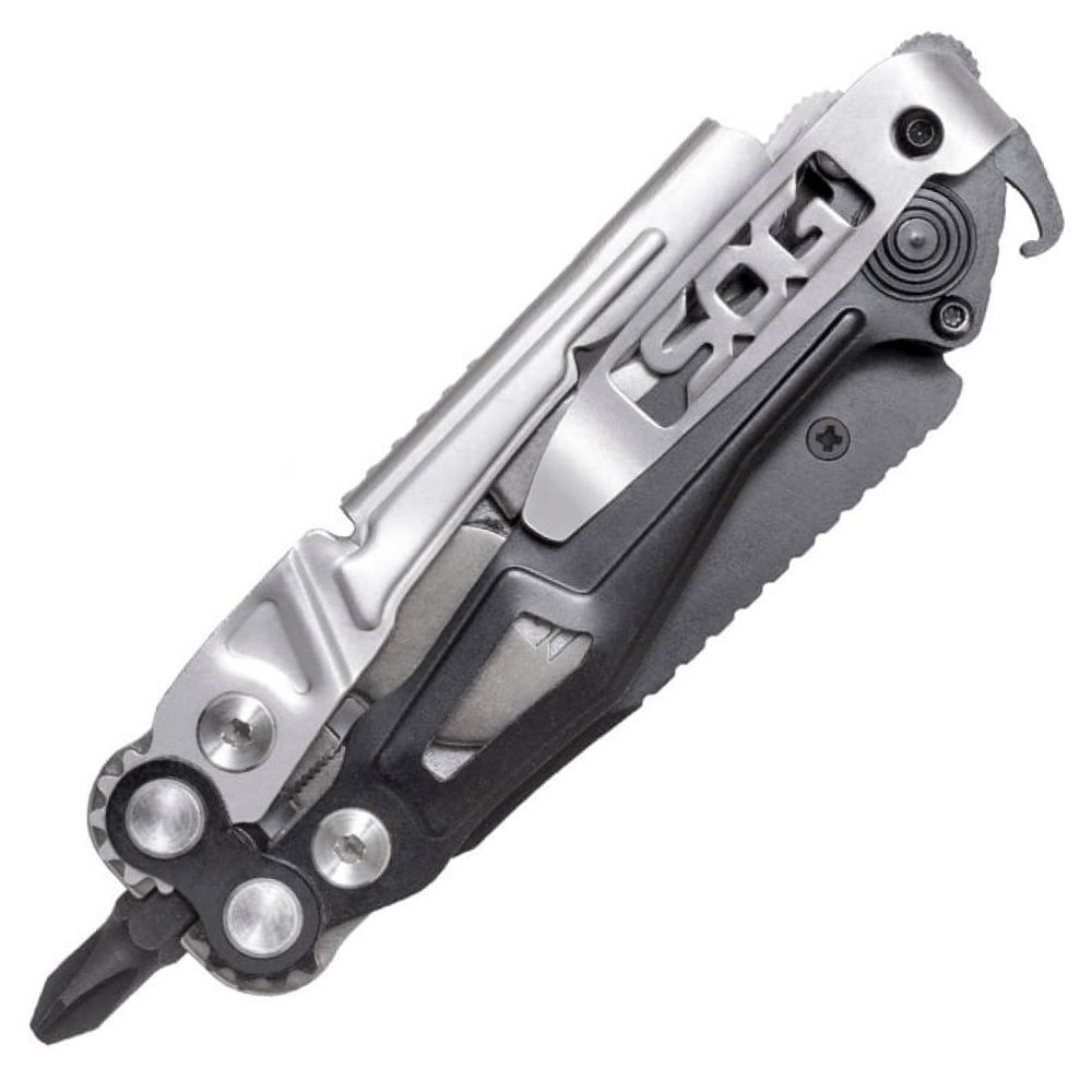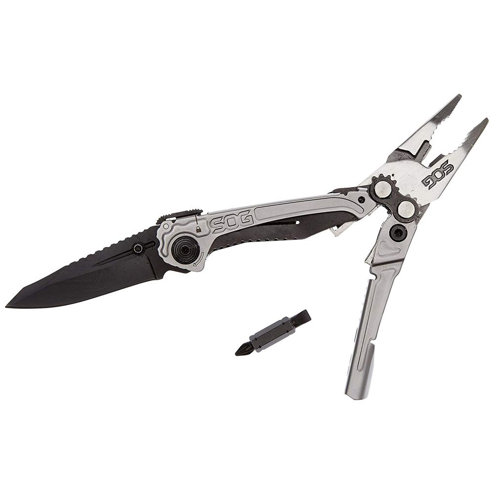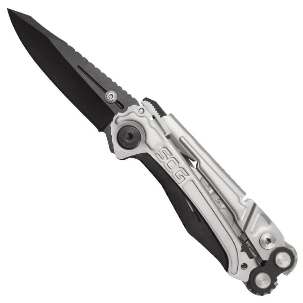 Housing a total of 10 components including a hardcased black coated stainless steel assisted blade and powerful Compound Leverage geared pliers, the Reactor proves to be a great folding knife and multi-tool. Retaining the easy opening characteristic like those found in other assisted folding knives was a main priority. Utilizing SAT (SOG Assisted Technology), a quick push of the thumb stud propels the hardcased black coated blade open and ready for action.