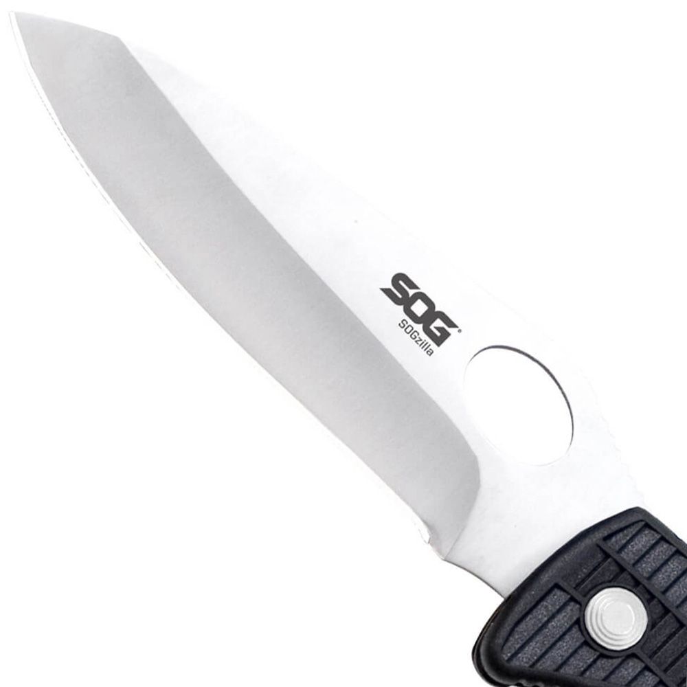 In devising this line that includes several sizes and blade shapes we wanted to make the Zilla distinctive. Zilla is fast, you wouldn't want to try and outrun him! The grip is a dual directional prehistoric armor plate and the big-bodied blade features a new opening shape... the likes of which has never been seen before. In hand, the knife points instinctually and feels familiar. Steel liners make a stout construction. Keep your knife caged in your pocket with our patented low carry reversible clip. SOGzilla... It's a new species. Don't be caught alone!