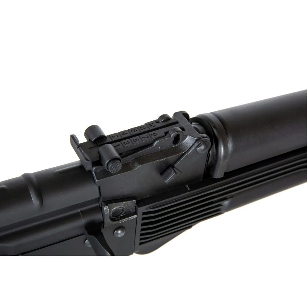 Specna Arms J-Series™ carbine replicas are made mainly of steel. Steel elements include the receiver, dust cover, external barrel, trigger guard, magazine latch, fire mode selector plate, gas pipe, muzzle device, tactical sling loop on the stock, rear sight, cleaning rod, stock latch, stock as well as pins and rivets. The remaining metal elements were made of a Zinc and aluminum alloy with a special coating used for their finish giving the replica a very realistic appearance. Similarly to the live firearm original, the foldable stock, pistol grip, magazine, handguard, and gas pipe shroud were all made of polymer.