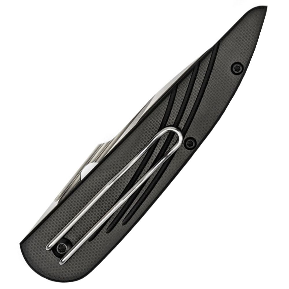 The handle tapers in a mirror image of the blade. Narrowing to a tip at the handle's back end the folder takes on a spike-like profile with a horizontal straight on the bottom of the knife running from the tip of the blade to the end of the handle. Inside is a Michael Walker Liner Lock, while outside the G-10 scales come assembled with an adjustable pivot and scale screws. A deep-pocket wire clip positions the folder for tip-down, right-hand carry.