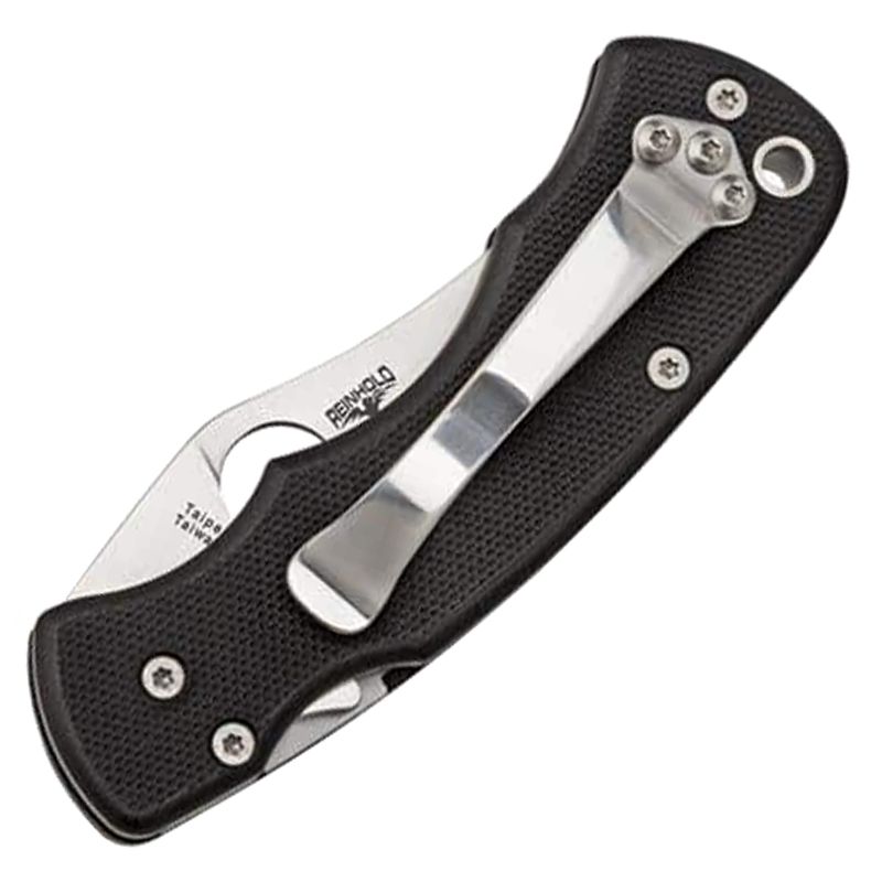 Designed by custom knifemaker Michael Reinhold, the Reinhold Rhino offers impressive strength and cutting performance in a very compact package. Its full-flat-ground Plain Edge blade is crafted from CTSBD1 stainless steel and features a sweeping profile that packs plenty of edge into its length. A Trademark Round Hole in the blade proudly identifies it as a member of the Spyderco family and allows convenient one-handed opening. The Reinhold Rhinos handle features thoughtfully radiused textured G-10 scales that offer a comfortable, hand-filling grip. A relieved cutout in the obverse scale allows easy access to the blades Round Hole for right-handed operation, while a reversible stainless steel pocket clip provides left or right-side tip-up carry. Stainless steel liners nested within the handles scales provide impressive structural strength and also form the foundation of Spydercos Compression Lock mechanism. This patented lock is extremely strong and allows the knife to be easily closed with one hand without placing your fingers in the path of the edge. A compact, do-everything folder, the Reinhold Rhino offers cutting power far beyond its size.