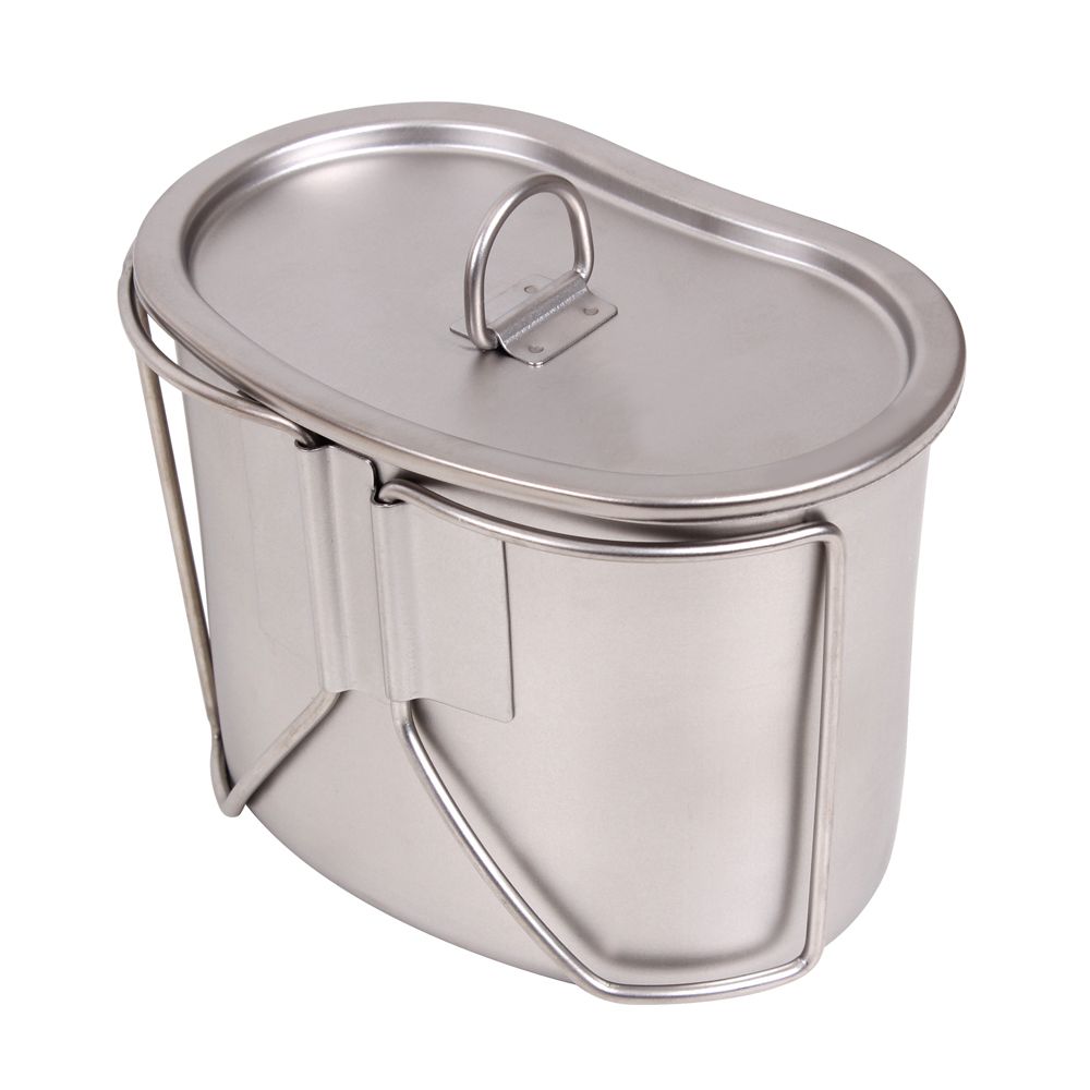 Stainless Steel Canteen Cup and Cover Set is ideal for camping, bug out bags, and cooking. The heavy gauge stainless steel canteen cup is durable and can be used drinking or cooking while camping, bugging out or hiking. Features a butterfly handle and comes with a convenient lid. Measurements for the stainless steel cup include: bottom - 4 1/2" x 2 7/8", top - 5 1/4" x 3 1/4", and the height is 3 3/4".