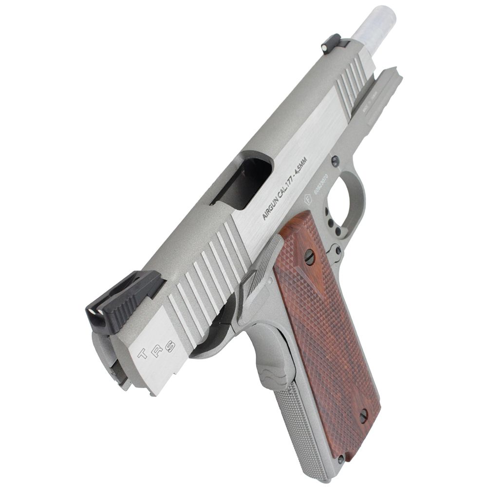 Customize your shooting style with the Swiss Arms TRS model BB pistol. It features a lower picatinny tactical rail, allowing you to upgrade your setup with a laser sight or flashlight mount. Like the other SA1911 models, this BB pistol has a replica full metal design, available with a matte black or stainless steel/wood grip finish.