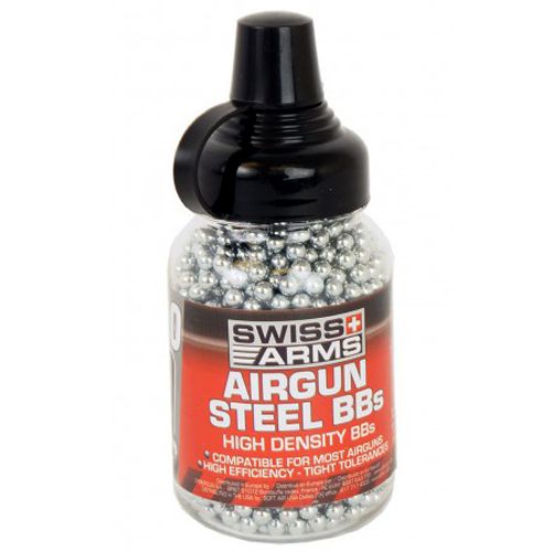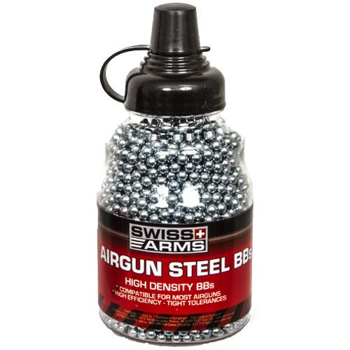 Step up your backyard plinking session with the Swiss Arms 4.5mm Steel BBs. These high efficiency projectiles have tight tolerances for improved accuracy and are compatible with most airguns. This bottle includes 1,500 rounds of firepower.