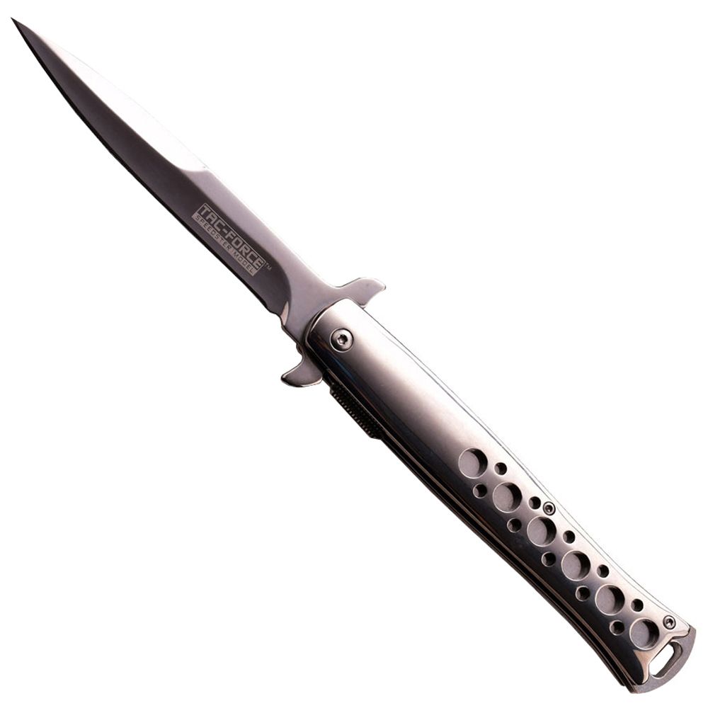 The Tac-Force Mirror Titanium Coated Folding Blade Knife is a sleek and durable tool designed for both style and functionality. The blade features a striking mirror titanium coating, providing enhanced strength, corrosion resistance, and a stunning reflective finish. The folding design ensures easy portability and quick access, while the ergonomic handle offers a comfortable and secure grip. Perfect for everyday carry and outdoor tasks, this knife combines cutting-edge materials with modern aesthetics for a truly impressive tool.