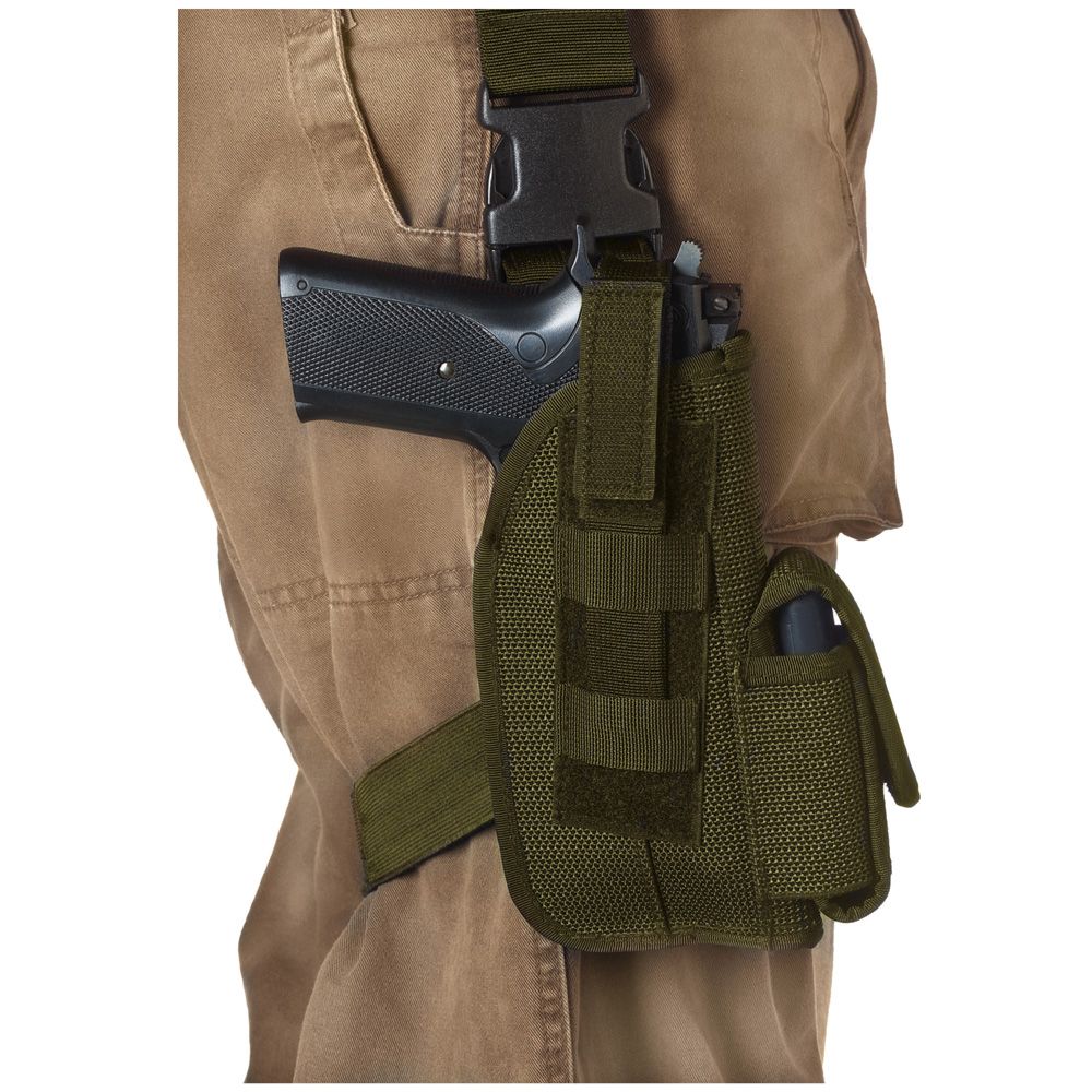 Tactical Holster is a tactical leg strap holster with a quick release belt clip, thumb snap and clip pouch ideal for ammo storage or personal accessories. Choose from a large frame 4" (Glock 17) or large frame 5" (Beretta 92).