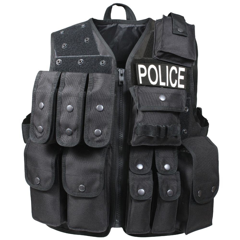 Black Tactical Raid Vest is made of superior polyester material. It is sturdily built and can be adjusted with snap closure. The words "Police" are written in bold letters across the back and on the left side in the front. It has a zipper front and it sports adjustable left and right sides . It has 3 pouches with flaps and each measures 4 x 7 inches. The snap and hook loop closure is an additional feature. It also has an option of attaching additional pouches and patches. It features a top carry handle for convenient handling. It comes with two blank black patches that vary in dimension.