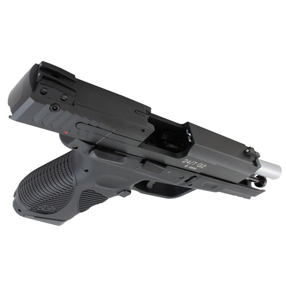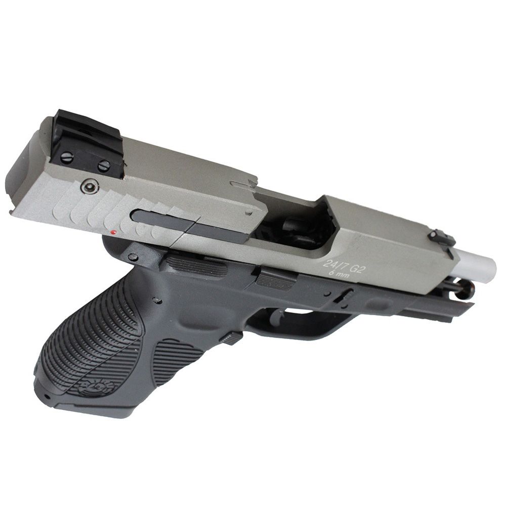 The Taurus PT24/7 G2 is ready for the battlefield any day of the week. This authentic airsoft pistol replica has all the same features as the real steel gun, including laser etched Taurus trademarks, a trigger saftey, and a customizble grip.