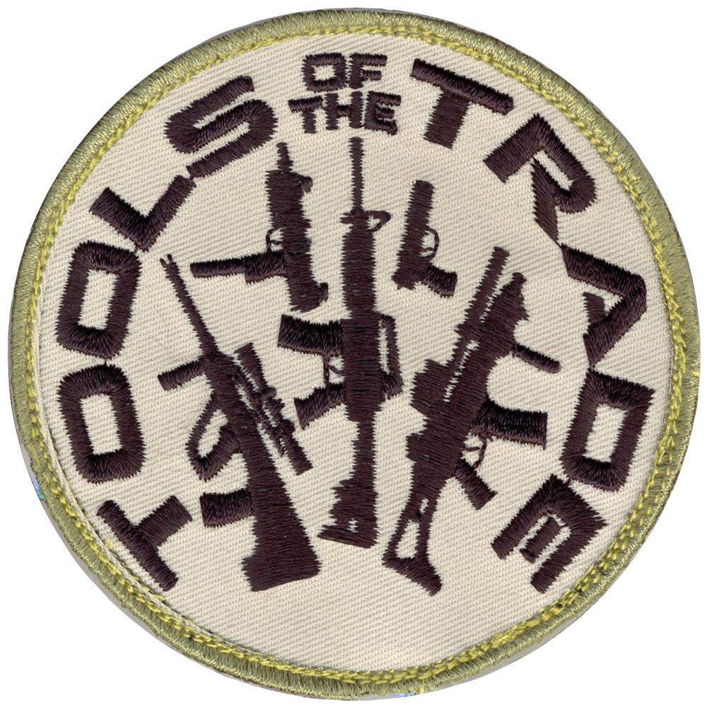 The Tools of the Trade Patch with Hook Back is one of the most elegant looking patches. It is a round shaped patch with some beautifully embroidered rifles and pistol in dark brown outline on a grayish background. The olive color border gives it a complete and good finish. This patch has a hook back, which makes it easy to be removed when not needed. It can be hooked on a cap or a T-shirt to enhance the casual look and feel of the clothing. This patch is available in a standard size and can be ordered online.