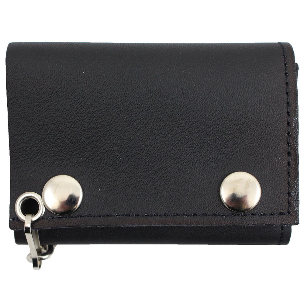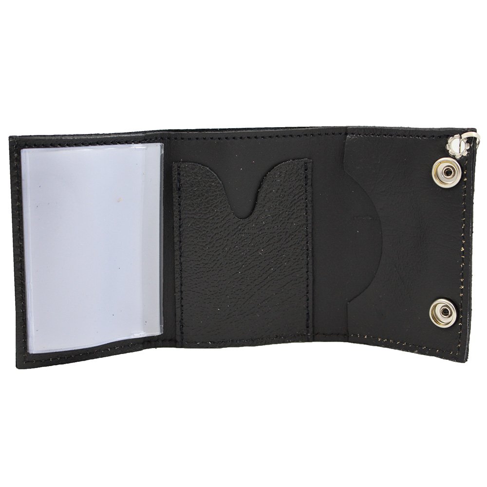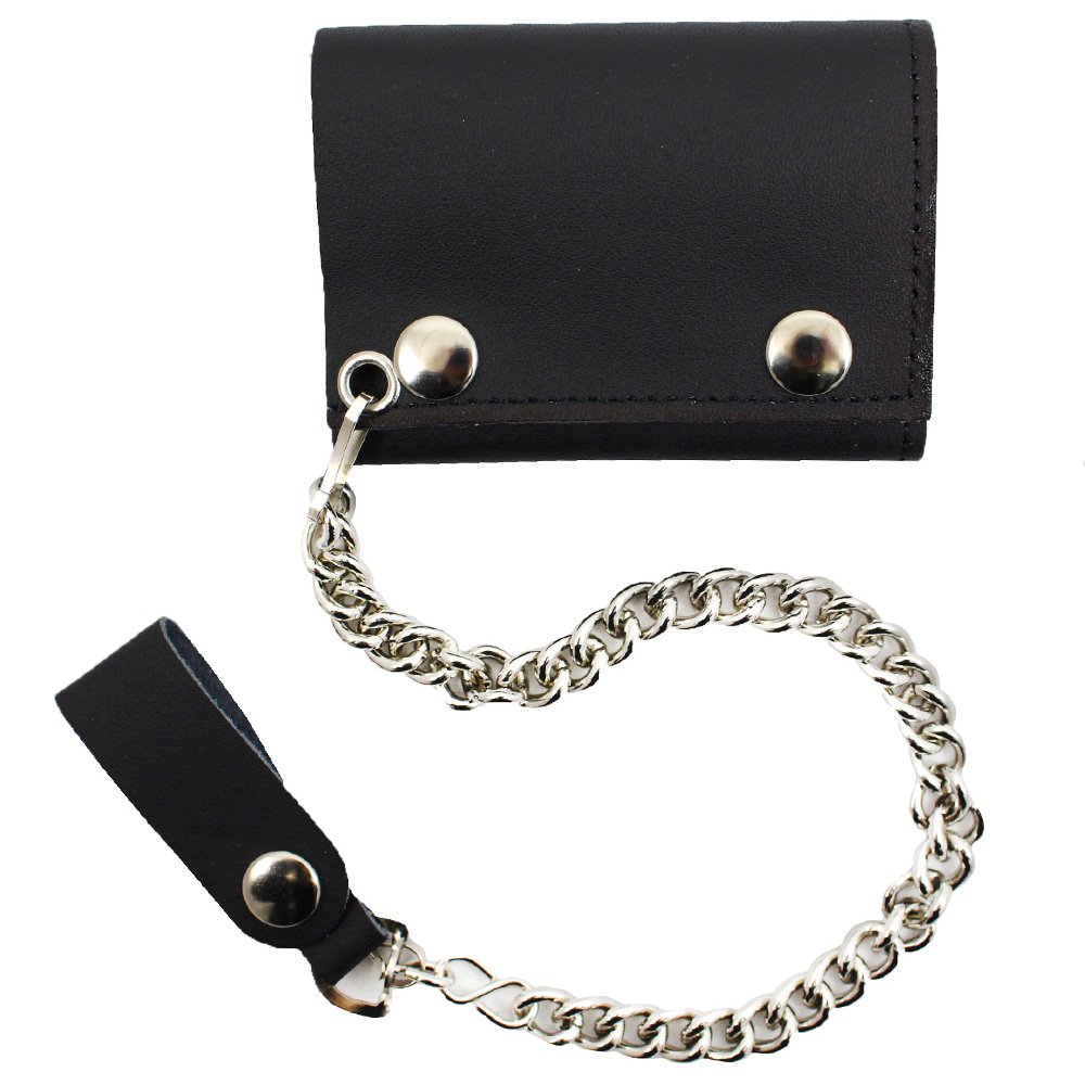 The Tri-Fold Leather Chain Wallet might be a party on the outside, but inside it is all business. This tough biker wallet has six ID windows, two card slots, and a bill slot to keep your money neat and organized. It closes securely with the two metal snaps. The included metal chain can be attached to a belt loop or bag. Measures 104 mm (4.1 inches) x 76 mm (3 inches).