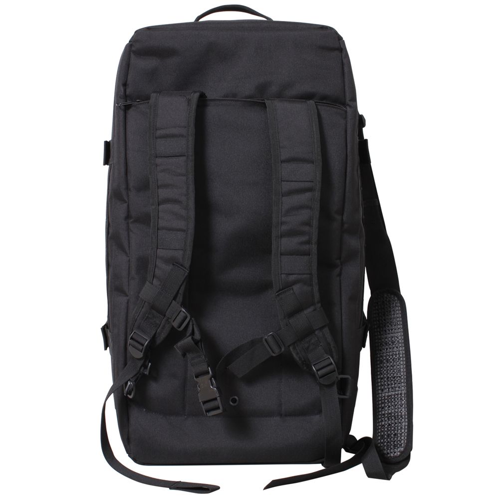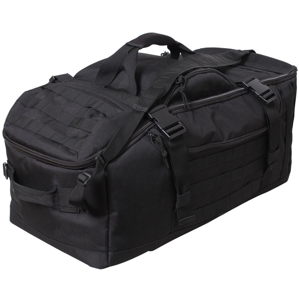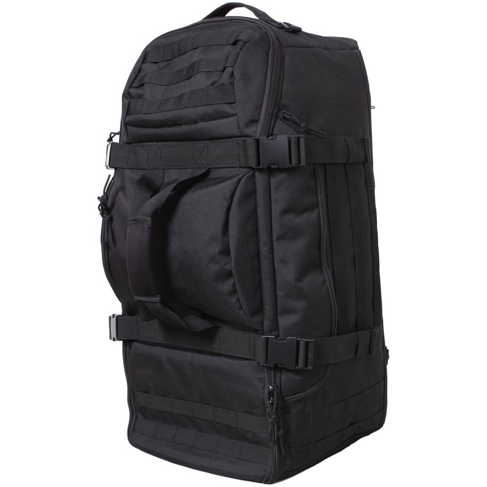 3 in 1 Convertible Mission Bag is the ultimate go anywhere tactical bag. This military style MOLLE pack measures 26" x 13&" x 11 and features a large main compartment with three sections with two zip-up dividers for easy storage of clothing and equipment. In addition, the interior of the pack features a top flap with a mesh zipper pockets for additional storage. The exterior of the convertible backpack features MOLLE (Modular Lightweight Load-carrying Equipment) Loops on the front, back and top of the bag, a top and side carry handles, detachable & adjustable shoulder strap, 2-cinch straps with quick release buckles, drain hole, 1 side exterior flap pocket, and a front and rear zippered pockets with mesh divider. The back of the tactical bag is padded for comfort and has a hideaway zippered compartment for the additional straps.