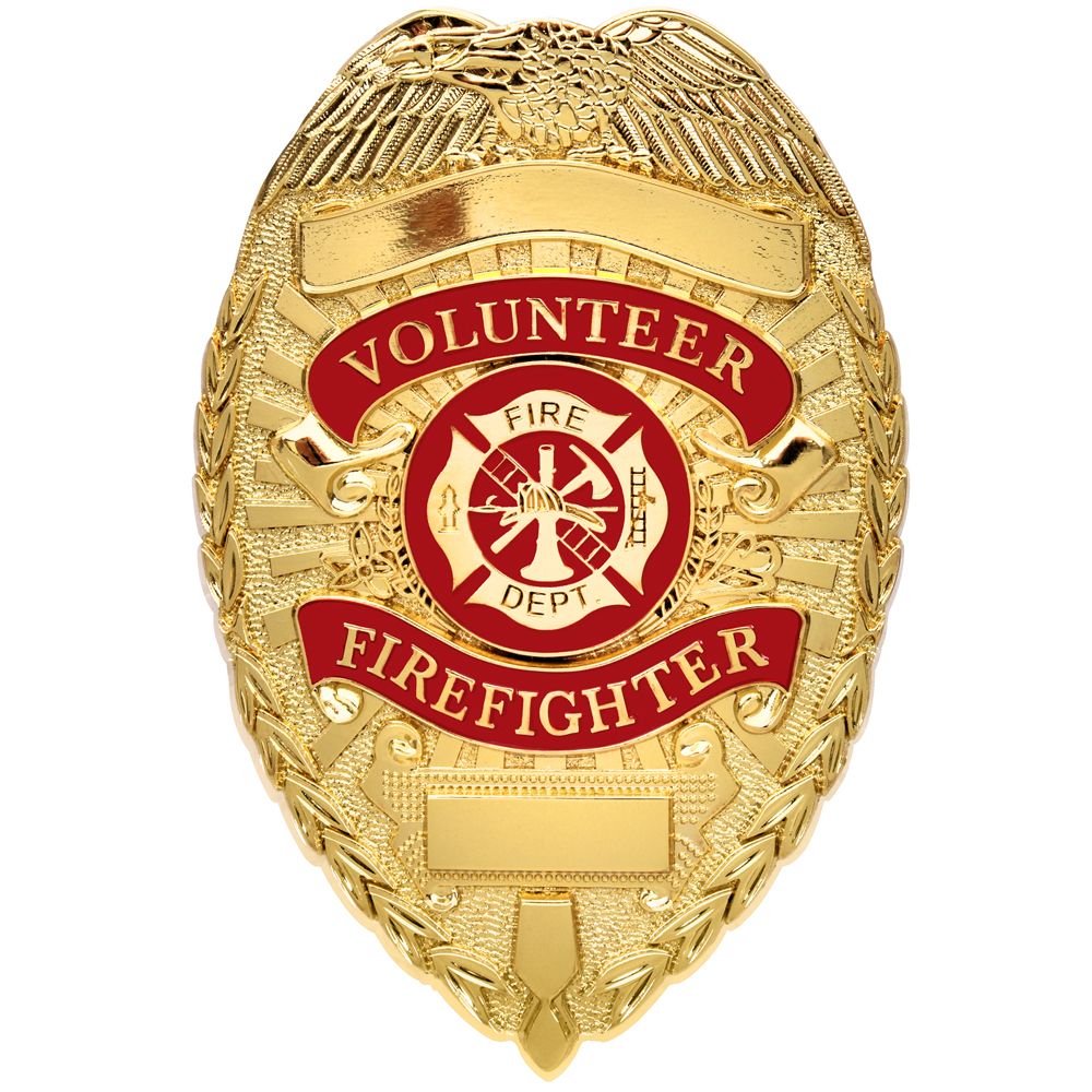 Deluxe Fire Department Badge is made of a zinc alloy shield with nickel or gold plating and has a pin back. Displays the text "Volunteer Firefighter." The badge measures 3 1/8" x 2 1/4"