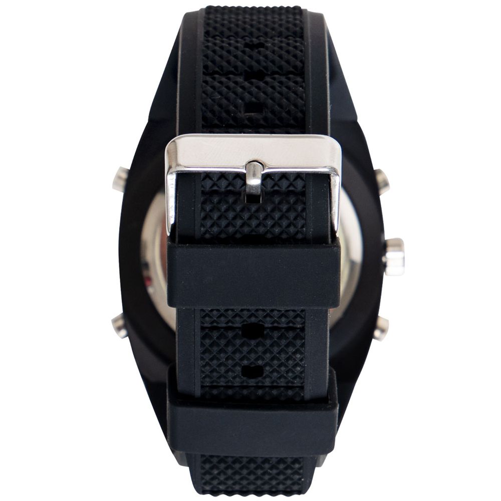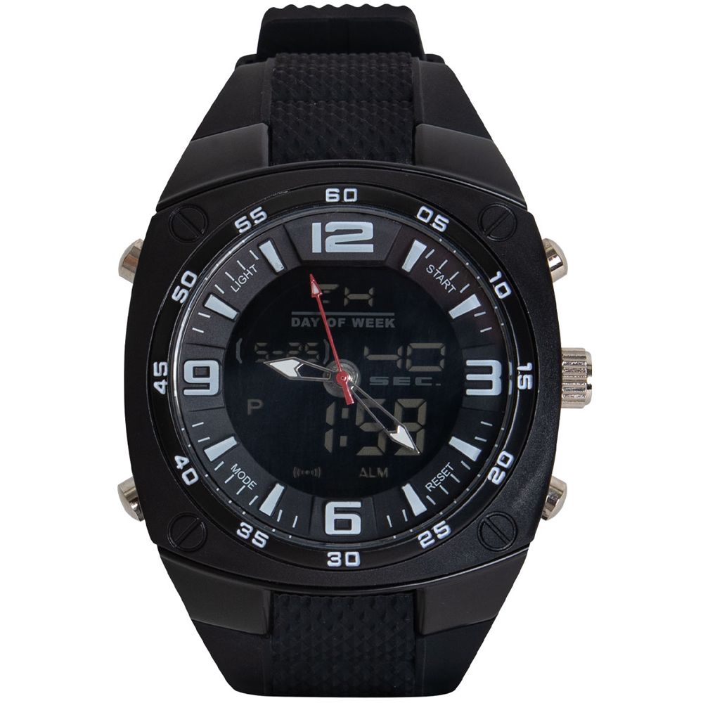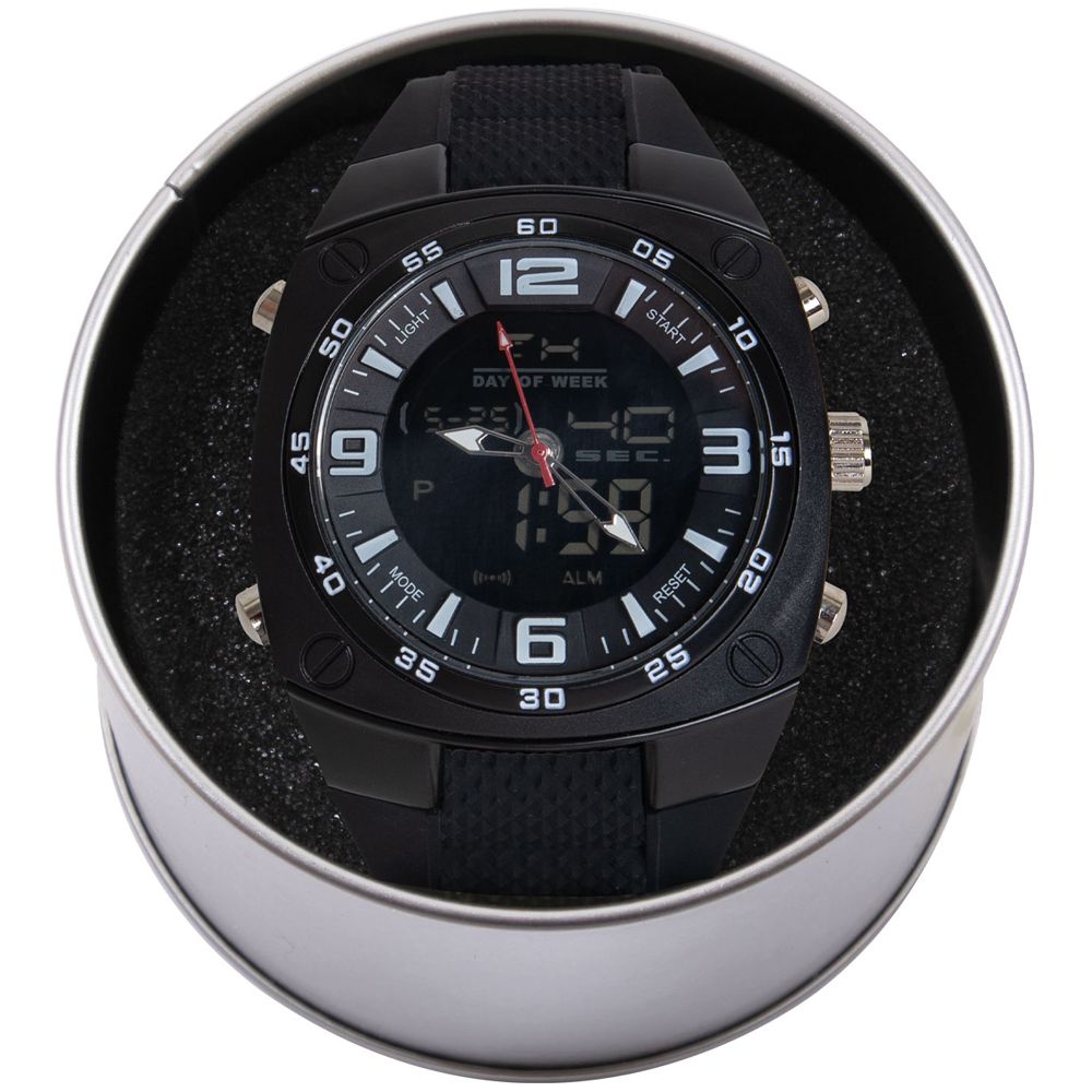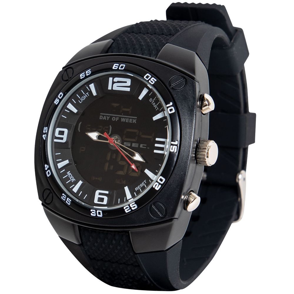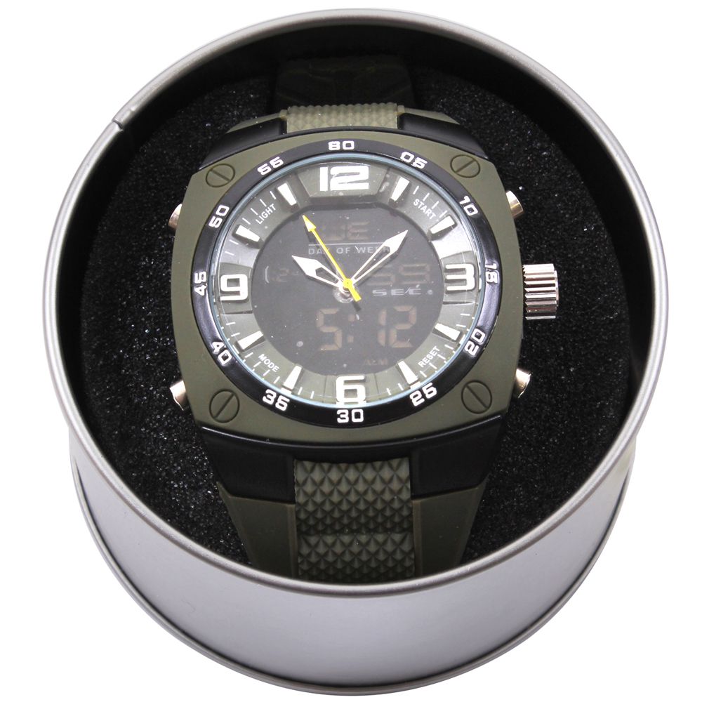 You will always get the time right with XLarge Military Style Analog & Digital Display Watch. This military-style watch features an over-sized face and a large, comfortable wristband.wristwatch displays time in analog and in digital with Japan quartz movement. Additional features include a stopwatch function, alarms, both standard and military time displays, and date display including the day of the week. The watch is water-resistant (1 ATM) making it great for all kinds of outdoor activities. A light-up digit function makes the time display easy to read in the dark and the watch comes in a zinc-alloy case for storage.