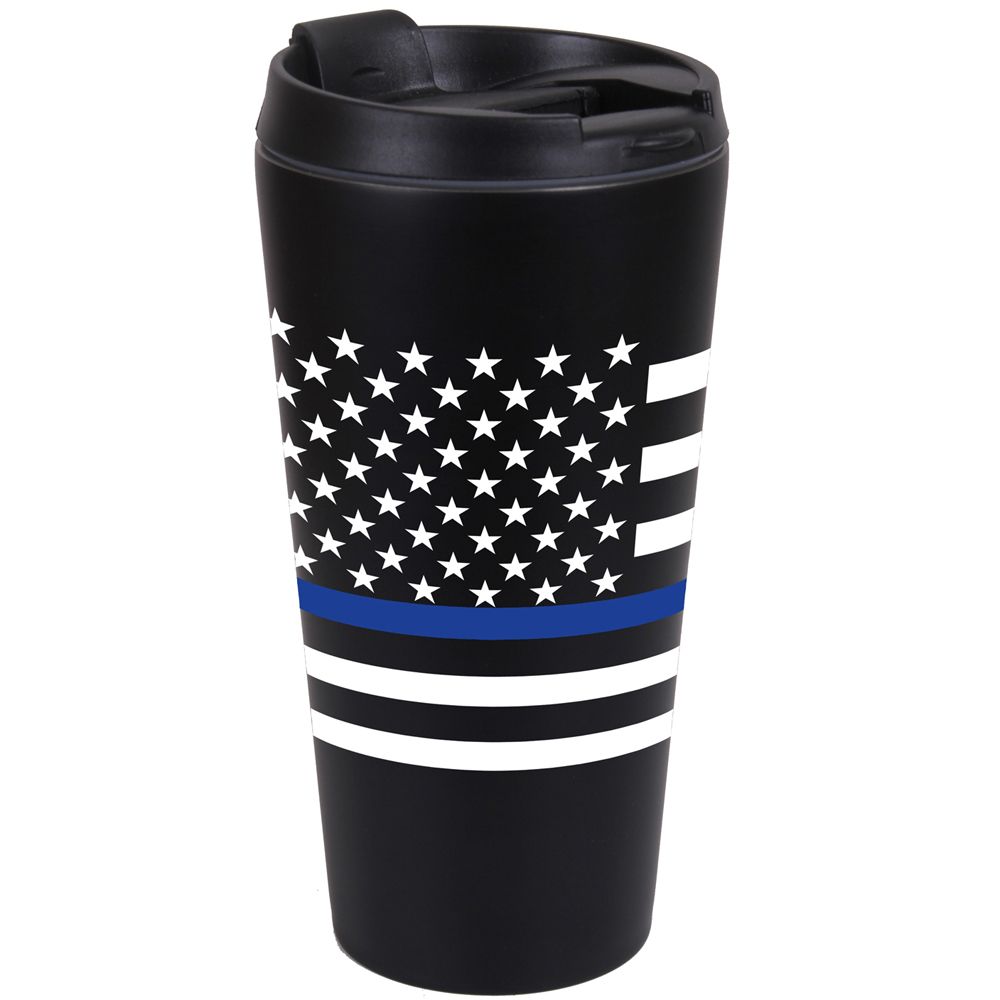 Show your support for the men and women in blue with Thin Blue Line Flag Travel Mug. This 16oz travel cup has a double-walled, stainless steel insulation to help keep drinks hot and fresh. A US flag with a thin blue line is printed on the front of the cup. The cap conveniently screws off and has a flip top for drinking. The thin blue line travel mug measures 6.75" height and 3.5" diameter at widest point. Perfect for on-the-go, cars or at the office.