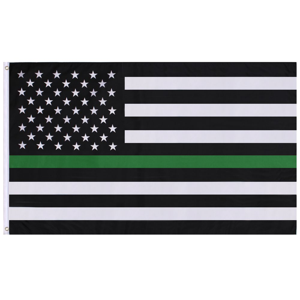 Thin Green Line Flag measures 3' x 5' and is made of a 100% non-shiny polyester material. The Thin Green Line represents support of Federal Agents such as Border Patrol, Park Rangers, and military personnel.