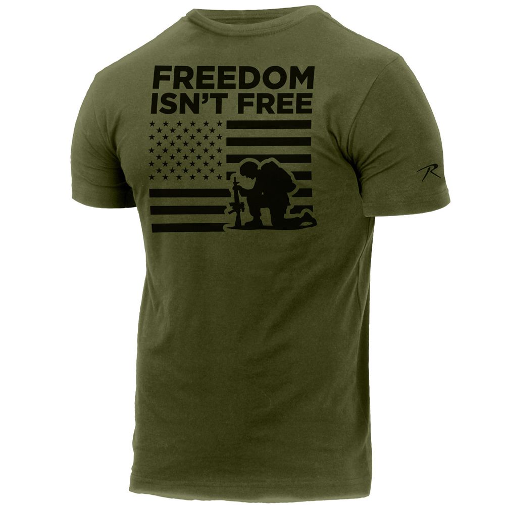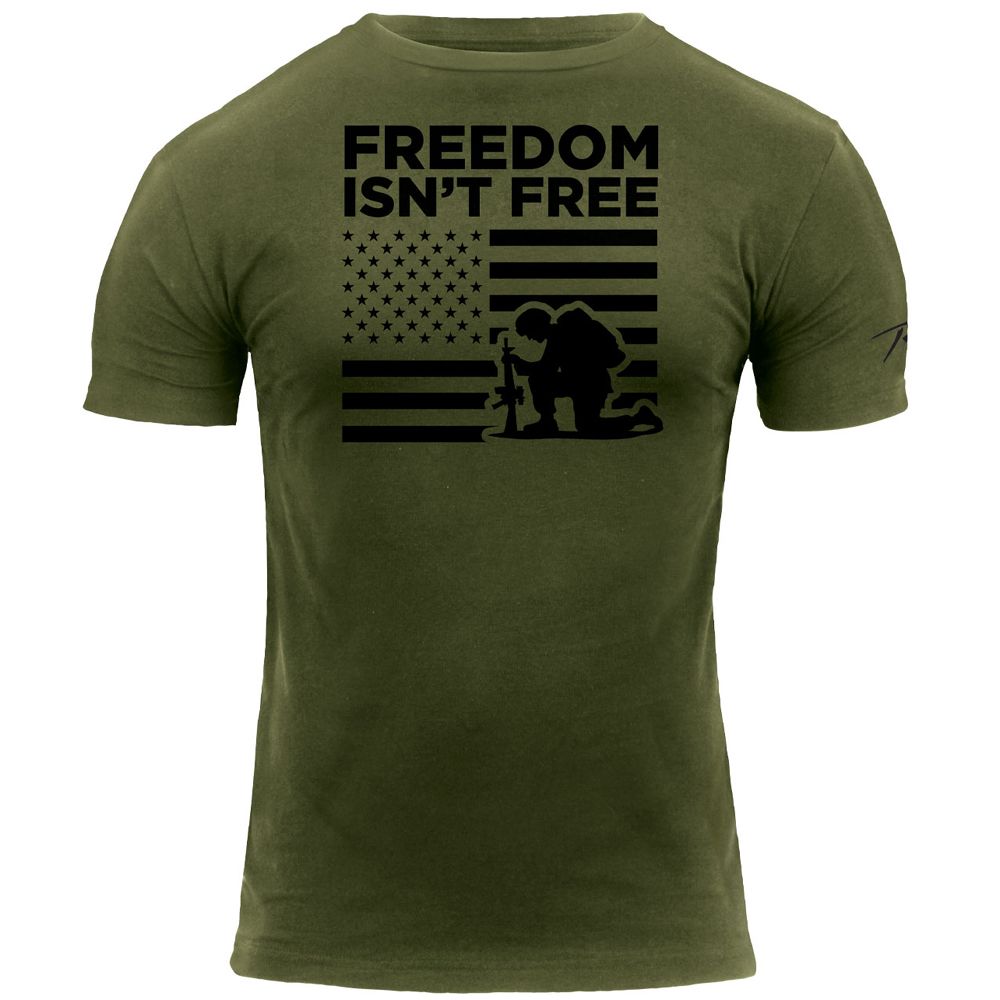 - Patriotic US Flag Print With a Kneeling Soldier and “Freedom Isn’t Free” Lettering Above Runs Across the Chest