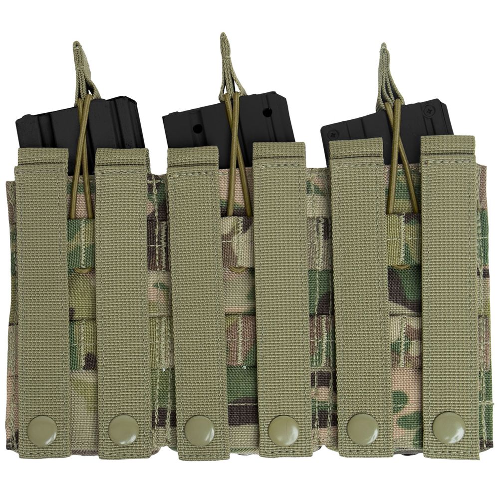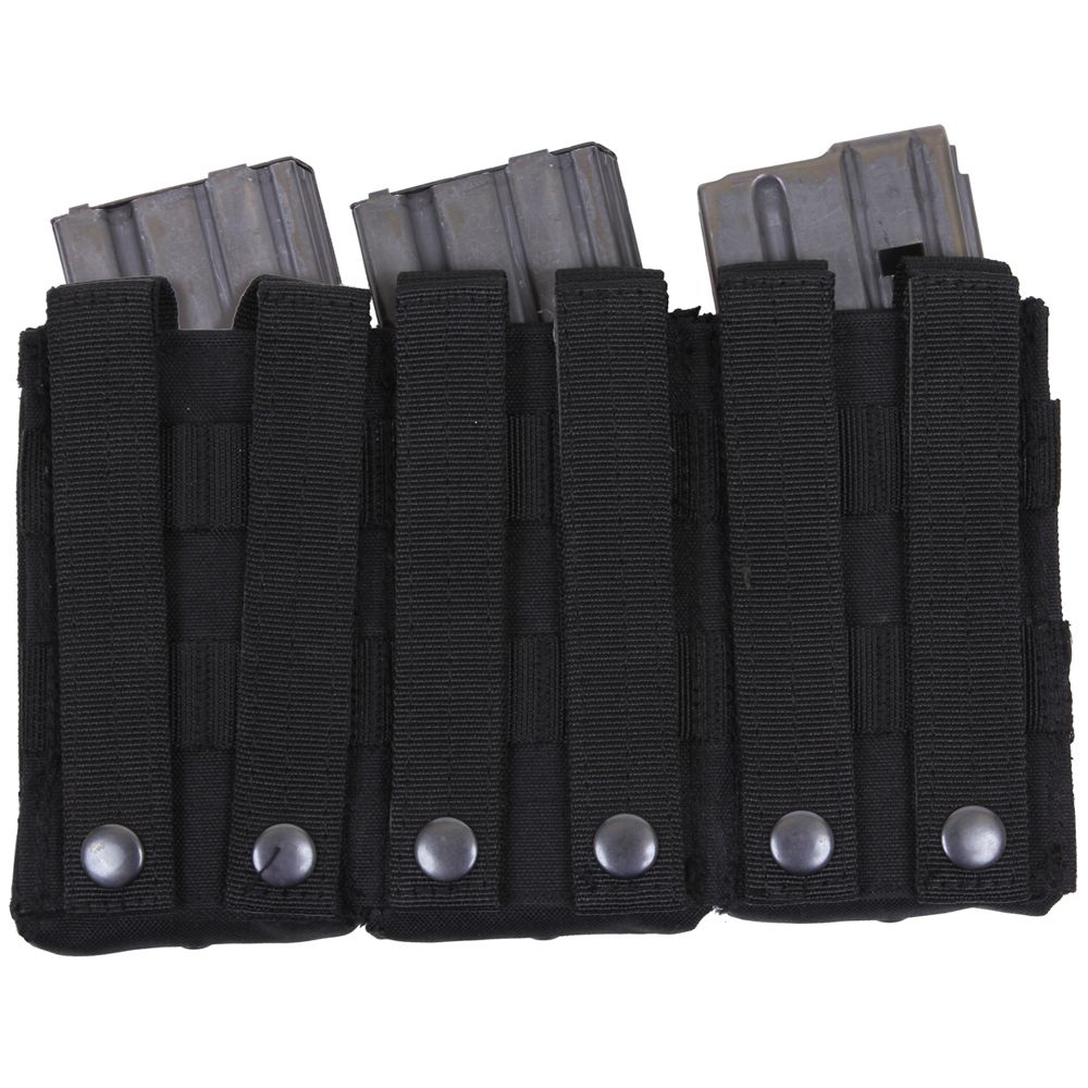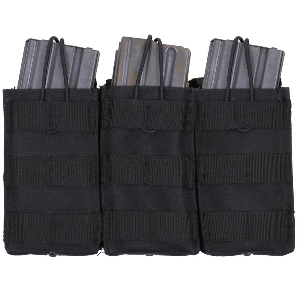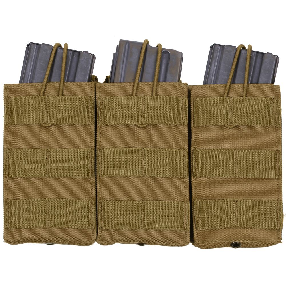 MOLLE Open Top Triple Mag Pouch is designed with 6 MOLLE straps on the back to fit securely with any MOLLE compatible item. Constructed of denier polyester this triple mag pouch is built to last with the utmost durability. The elastic cord closure provides quick release access while holding your magazines securely in place. This magazine pouch features vent holes for drainage. Measuring 9 ¼” X 5 ½”, these MOLLE mag pouches are perfect complements for plate carrier vests and transport packs.