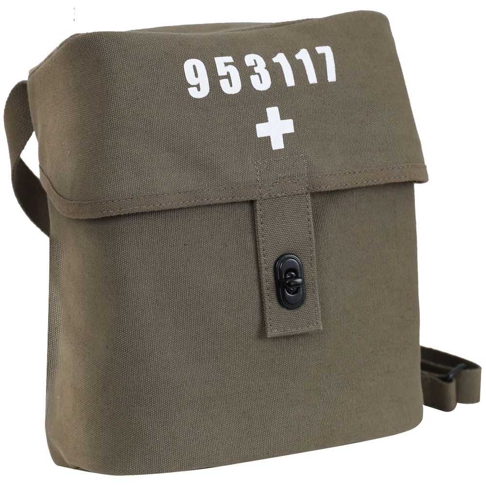 Military Shoulder Bag is constructed of heavyweight cotton canvas for maximum durability. The shoulder strap on this canvas bag is fully adjustable with a full length of 54 ¼” and is made of cotton webbing material. This military shoulder bag features a fold over storm flap that securely closes with a metal revolving closure and vintage military inspired screened cross and numbering at the center of the storm flap. the main compartment is perfect to store your essential items and gear. 2 Metal D-rings and plastic buttons are featured on the canvas shoulder bag as well.