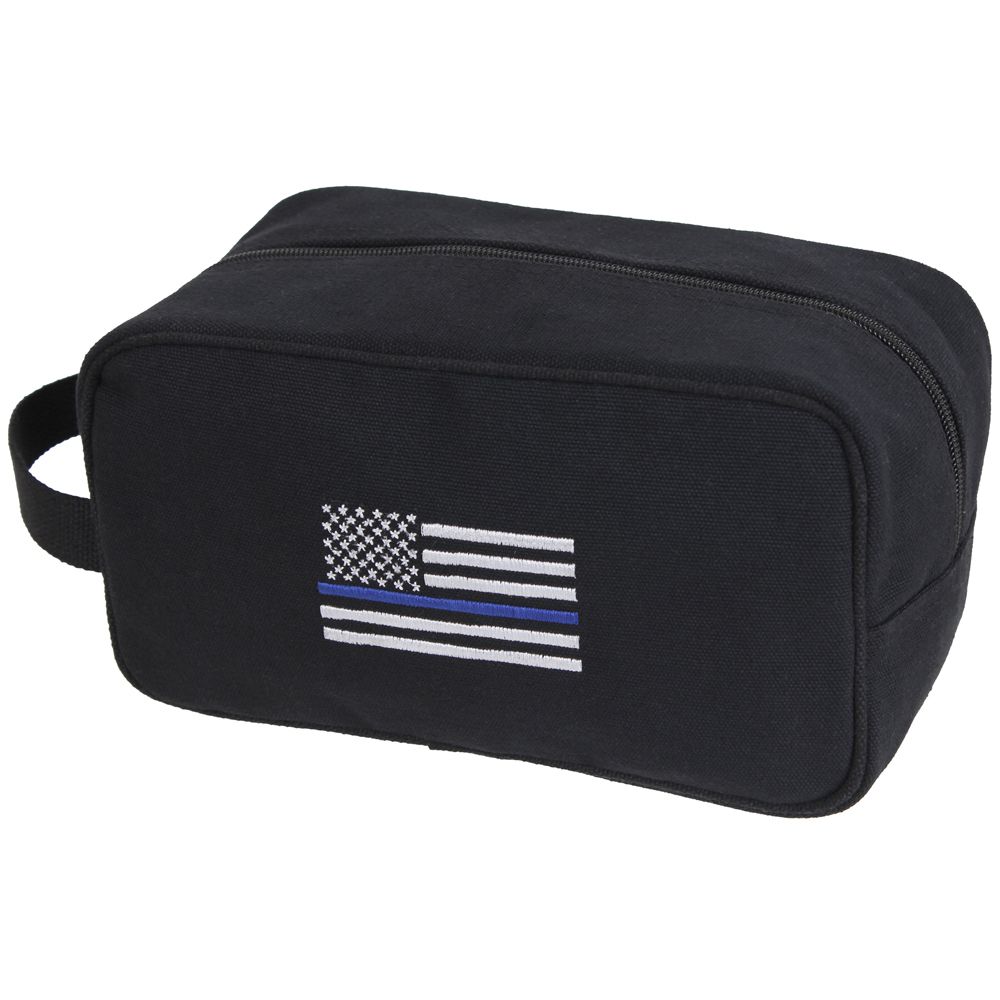 Fit all of your toiletry needs and more into Thin Blue Line Canvas Travel Kit! The side webbing carry handle gives you the convenience of taking it with you as you travel and the easy access zipper makes it effortless to retrieve your items.Thin Blue Line Canvas Travel Kit Bag measures 10" x 5" x 5" and features embroidered Thin Blue Line American Flag on the side. The Thin Blue Line Shows Respect And Support For Police And Law Enforcement Officials.