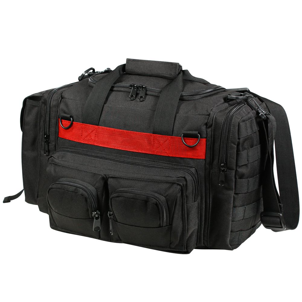 The Thin Red Line represents the camaraderie and sacrifice of firefighters and first responders to fires and disasters; show your support with Thin Red Line Concealed Carry Bag. This concealed carry shoulder bag is made from durable 600D polyester with PVC coating and polypropylene webbing with a thin red line on the front and back. The tactical bag features carry handles, as well as an adjustable and removable shoulder strap and 2 front D-rings.Thin Red Line bag has optimal storage options, with a large main compartment, a large side pouch with flap and quick release buckle closure, a large side zippered pouch with exterior MOLLE attachments, 3 zippered pouches in front, and a rear zippered pouch with the loop side of a hook and loop for concealed carry attachment.