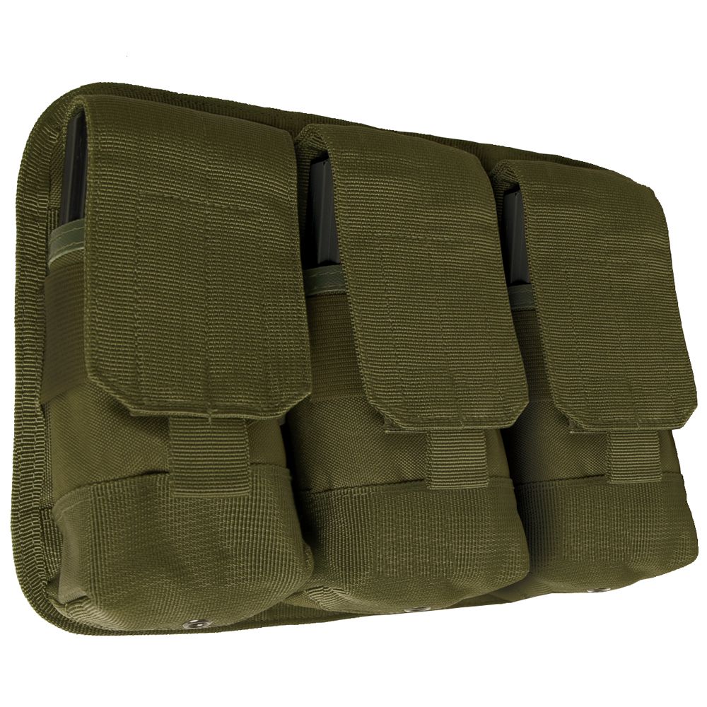 Universal Triple Mag Rifle Pouch can fit six M-16 or three AK-47 magazines, making this triple magazine pouch the optimal choice. The universal rifle mag pouch features six MOLLE straps on the back to attach to any of your MOLLE compatible gear. These MOLLE magazine pouches feature adjustable flaps with hook and loop closures to keep your ammunition secure. Each magazine pouch contains an elastic band and grommet hole at the bottom for drainage. Measuring 7 7/8” X 11 7/8”, the rifle magazine pouch is constructed of denier polyester for maximum durability.