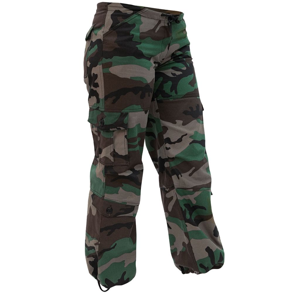 Women Unwashed Camo Paratrooper Fatigues feature 8 versatile pockets and are perfect for any occasion. Made of a super soft and durable ramie/cotton blend, these paratrooper fatigues are not only comfortable and soft, but they are also built with maximum durability and are lightweight. Zipper fly, drawstring ties, and a button are present on these camo pants as well.