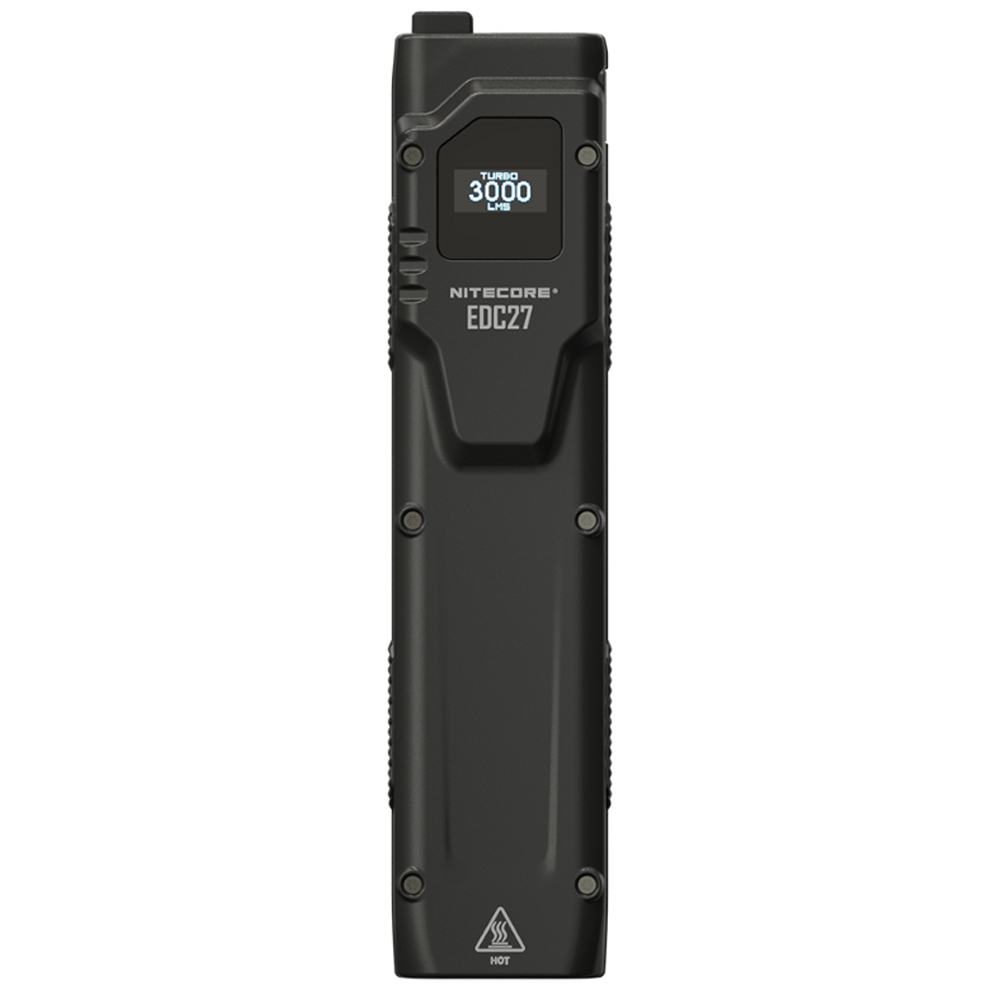 The EDC27 features a multi-functional OLED display screen which provides real-time information on brightness levels, remaining runtime, battery voltage and lockout mode. To prevent accidental activation, the torch has a half and full lockout mode which display as either 1 or 2 respectively, on the screen.