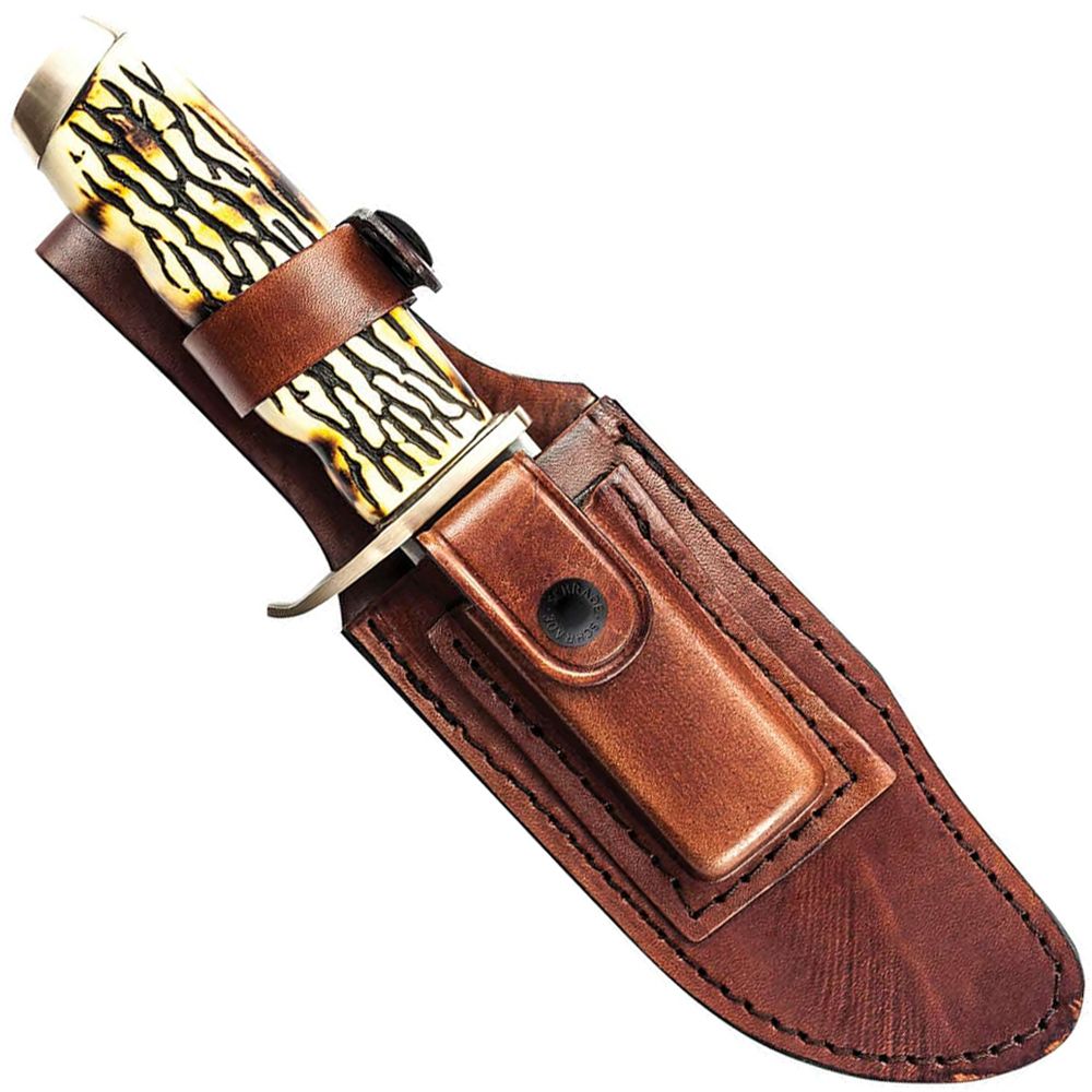 Uncle Henry Large Pro Hunter Rat Tail Tang Fixed Blade Knife, 7Cr17MoV High Carbon Stainless Steel Clip Point Blade, Staglon Handle with Brass Guard and Pommel, and Brown Leather Belt Sheath with Sharpening Stone.