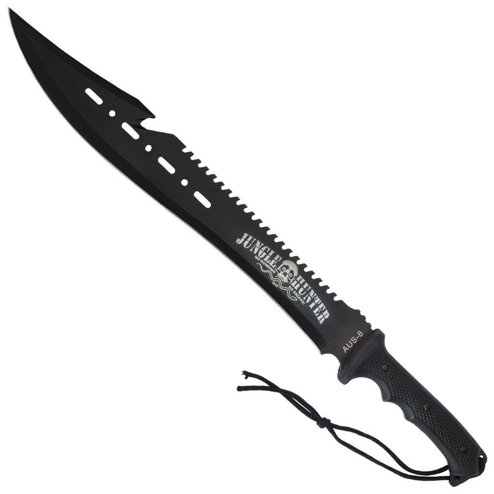 Don’t brave the jungles without this brand new Jungle Hunter from Black Savage. Crafted of one solid piece of cold, rock-hard AUS-8 stainless steel, this full-tang beast measures in at a whopping 25” overall. The razor sharp blade features cut-out designs, heavy sawback serrations, and a durable baked-on black finish. The oversized, rubberized handle is textured for a sure, confident grip, and features a lanyard. Includes a durable nylon belt sheath for convenient storage and easy transport.