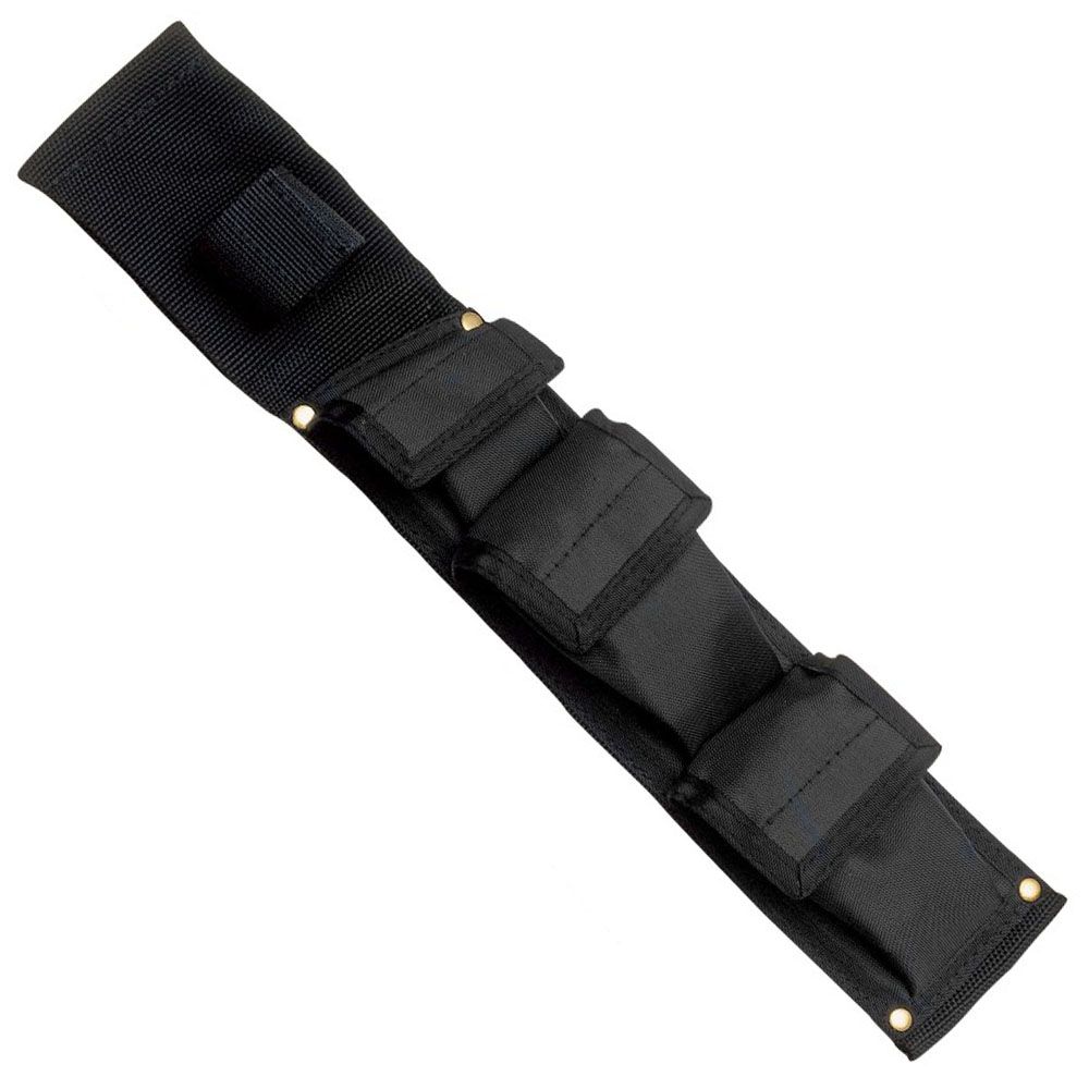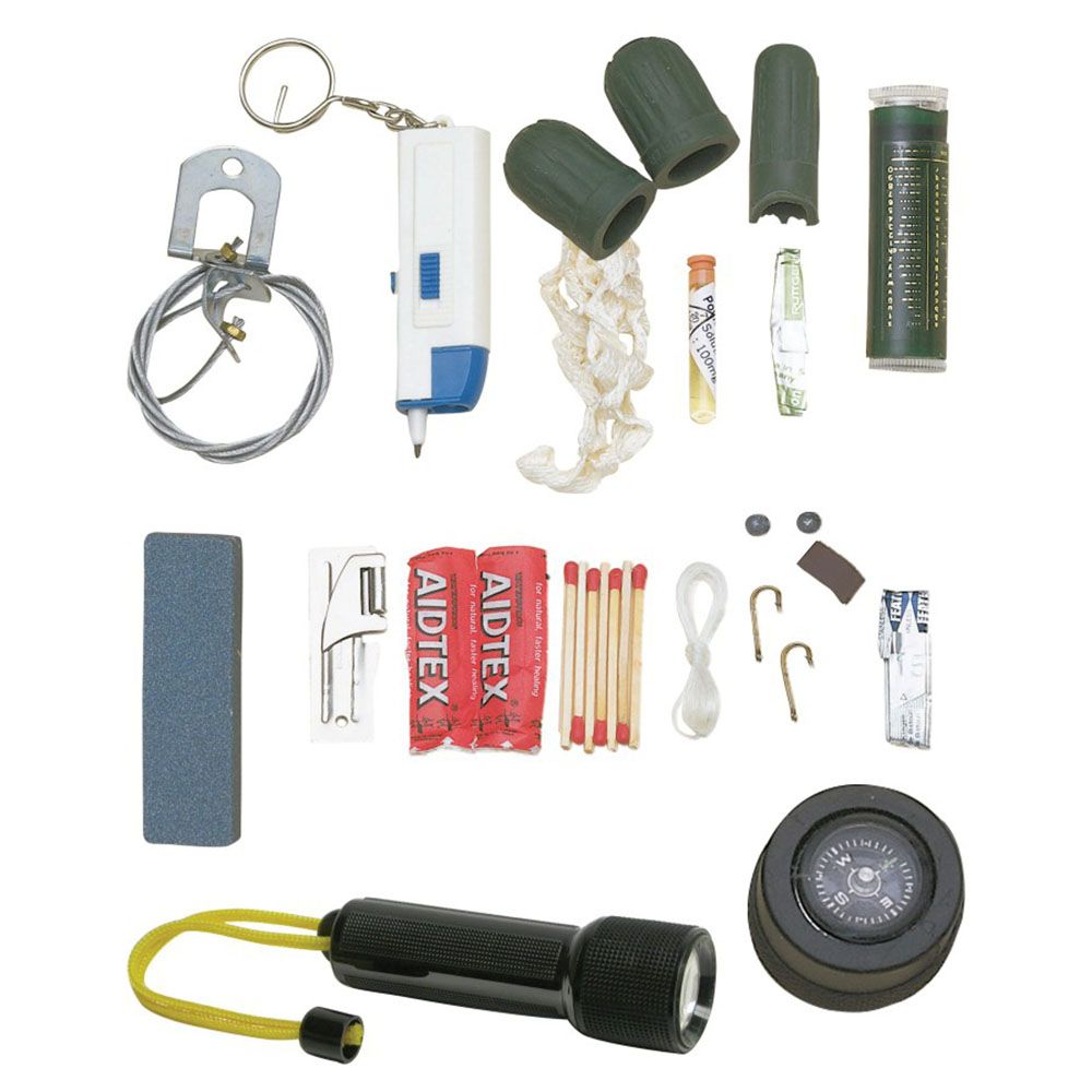 This knife features a 10" 420 J2 stainless steel blade and a black cast metal handle with detachable hand guard that stores survival items (sewing needles, band-aides, matches, surgical blade, magnifier, fishing hooks, line and sinkers). Precision compass built into the butt cap. Includes heavy nylon sheath with protective plastic blade shell that holds G.I. can opener, sharpening stone, animal snare, snakebite kit, and 4" flashlight with yellow lanyard cord (AA battery not included). 15 1/4" overall.