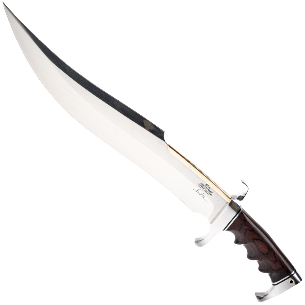 Marking Gil Hibben’s incredible legacy, we’re proud to offer the Gil Hibben 65th Anniversary Knife and Display Stand. The impressive knife has a 15 1/8”, 5Cr15 stainless steel upswept blade with a mirror polished finish and a polished brass spine accent. The dark pakkawood handle is comfortably finger-grooved and is bookended by a hefty chrome-plated handguard and pommel. The 20 5/8” overall knife can be displayed on the included glossy wooden stand, which features an antique brass finished, 65th anniversary coin.