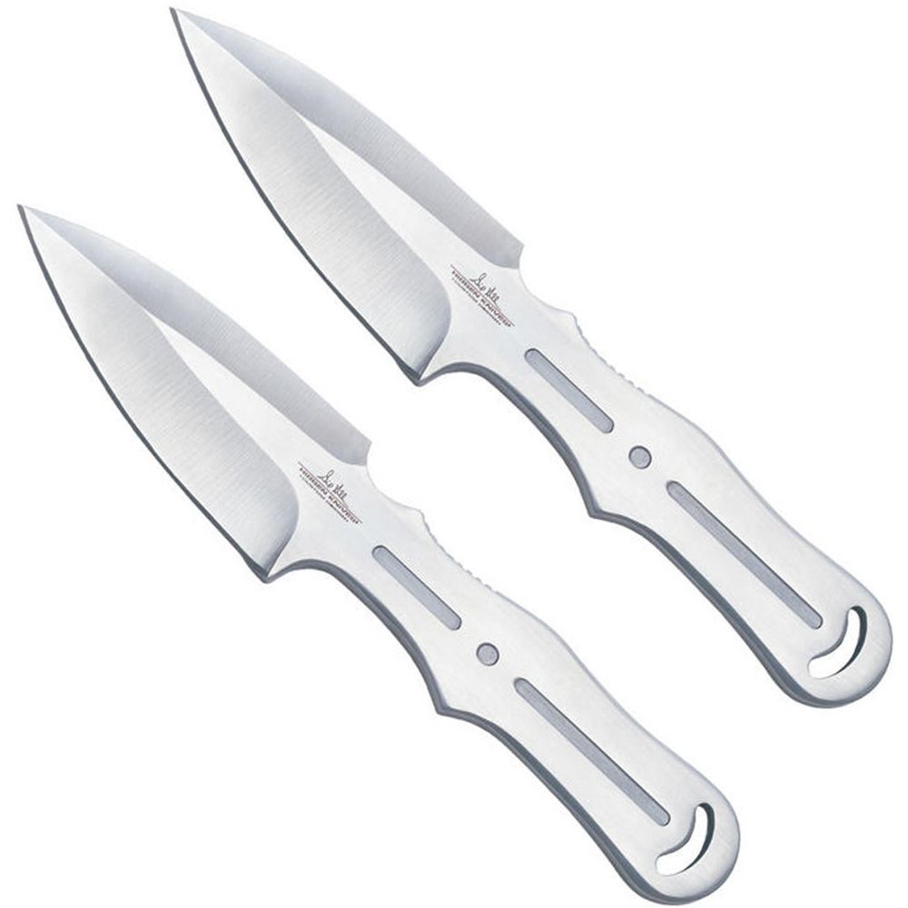 The Pro Thrower line is designed for speed and accurate release. If Gil Hibben trusts these knives, why shouldnt you? Constructed of one-piece of 420 stainless steel, sets have a trigger-grip design that guides them into the same consistent and accurate release each time they are thrown and include leather sheaths. 8 1/4" overall.