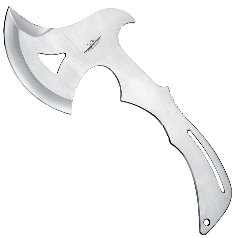 These throwers are perfectly balanced with one-piece tempered stainless steel construction. The Pro Thrower Axe has a trigger-grip design that guide it into the same consistent and accurate release each time they are thrown. Includes leather sheath. 12" overall.