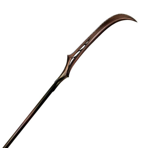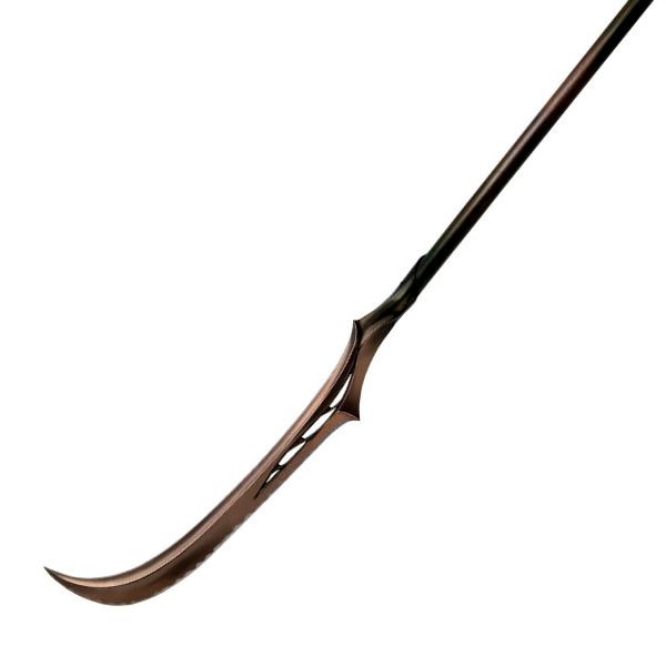 The Woodland guard are the soldiers of the Elvenking, sworn to protect and watch over the northern lands of the great forest of the Woodland Realm. Among their weapons is this polearm, crafted with a greenwood shaft and two curved Elven blades forged of bronzed steel with a Silvan steel edge of superior strength. This replica features bronze-finished cast stainless steel blades and a hardwood handle shaft. It is presented with a wooden wall display featuring a Wood Elf graphic motif. 21 1/8" blades; 72 1/8" overall