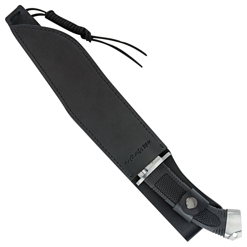 This Honshu Boshin bowie by United Cutlery would be a prized trophy in anyone’s collection! Featuring a 9 1/4" full-tang, razor-sharp 7Cr13 stainless steel blade with a wicked curve and a deep blood groove, this knife is built for tough use. The rubberized, textured handle is oversized and offers a comfortable, confident grip. A heavy guard and pommel with lanyard hole complete the thoughtful design of this massive bowie. Measures 15 1/4" overall. Includes a heavy-duty, reinforced leather belt sheath embossed with the Honshu logo.