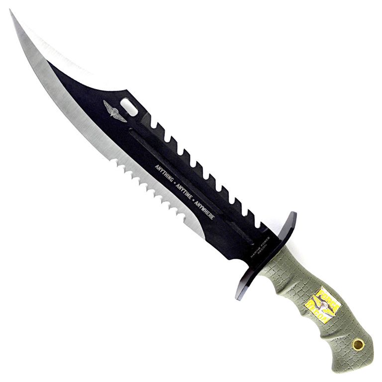 “Anything, anytime, anywhere.” You’ll never find a mission the Marine Force Recon can’t accomplish – especially with the help of this massive sawback bowie. It features a 11 1/2” coated AUS-6 stainless steel blade that is corrosive resistant and offers a non-glare finish. An over-molded rubber handle grip feels great in your hand and the coated metal hand-guard will keep your fingers from slipping onto the blade. Includes a durable nylon sheath.