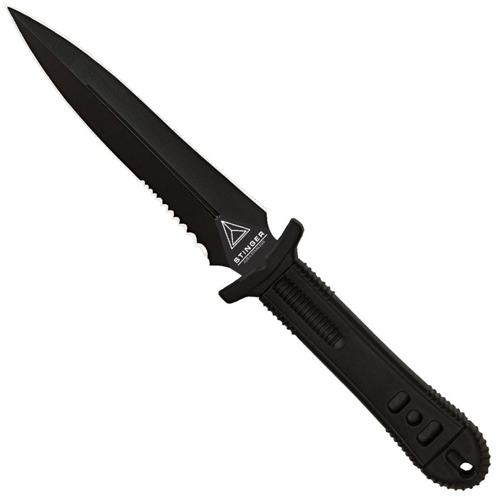 Designed for high impact combat, this stinger dagger is equipped with a black-coated AUS-6 stainless steel blade and a black Santoprene handle. Includes a nylon shoulder. 5" blade, 9 1/4" overall. Sheath: Nylon shoulder harness.