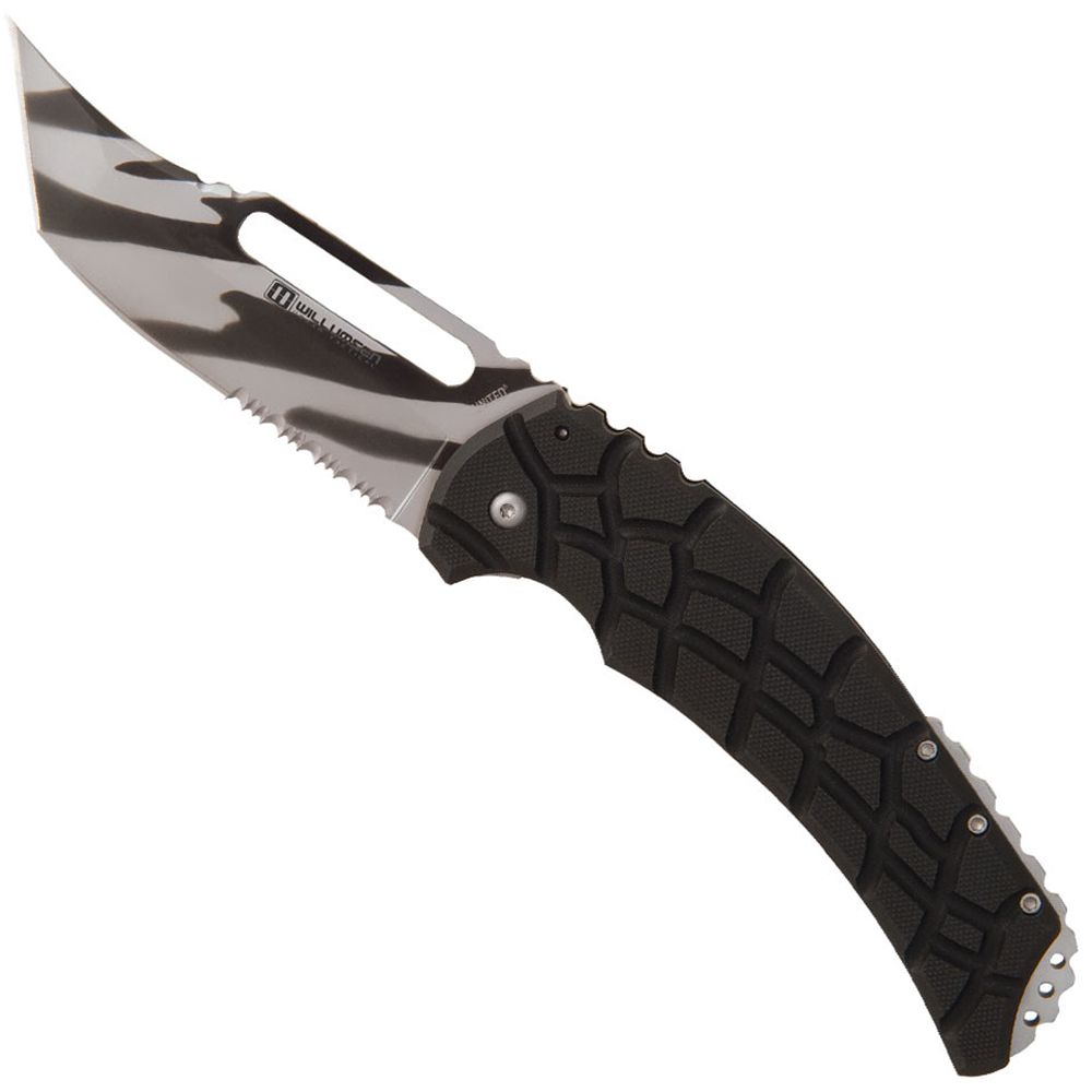 This Willumsen Urban Tactical Blondie folding knife has been hand-crafted with scrupulous details offering an exact representation of a Willumsen custom knife. Rugged G-10 handle scales have been deeply jigged for an impressive grip and a tactical appearance. An aggressive-tanto-point, urban camo-coated 440C stainless steel blade with a serrated edge has been honed to a razor’s edge and its high-carbon content gives it an amazing edge retention quality. An oversized thumbhole allows for easy one-handed opening and a stainless steel pocket clip ensures your new knife will remain tight in your pocket or pack in transport. 4 3/8” blade, 5 3/4" closed, 10” overall.