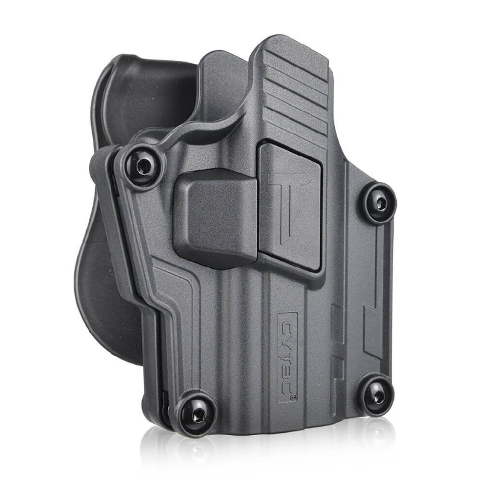 Compatible & Incompatible: Compatible with 4" barrel compact to 5" barrel full size, work with 4.5" is best which like Glock 17, the barrel is neither long nor short; Incompatible with sub-compact or micro-compact. The bottom of the holster is open to support the longer barrel sticking out.