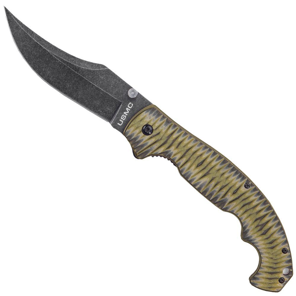 The USMC Fallout Tactical Pocket Knife’s blade is made of rugged 3Cr13 stainless steel and boasts a finely-honed edge, distinctive tactical profile and a stonewashed finish. The advanced assisted opening mechanism and accompanying thumb studs and flipper, allow for fast, one-handed blade deployment. Ridges on the durable G10 handle reduce slippage, while well-placed thumb grooves and superb balance improve control and overall feel. The stonewashed pocket clip with its USMC cutout gives you convenient carry options.