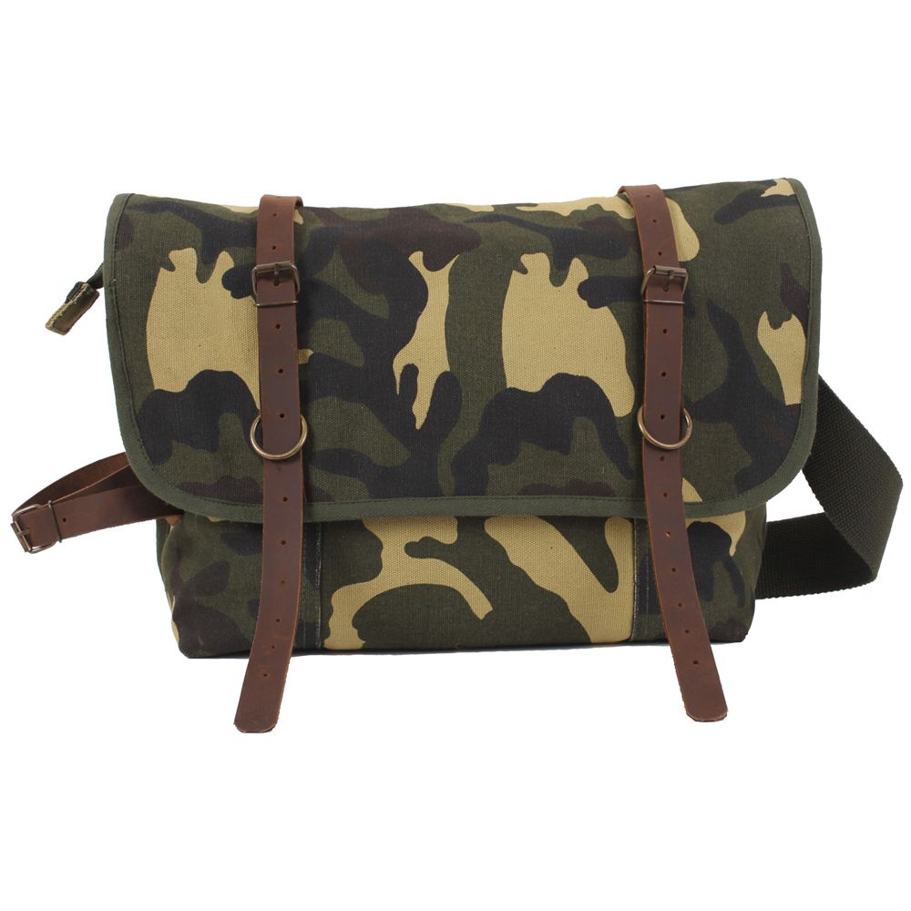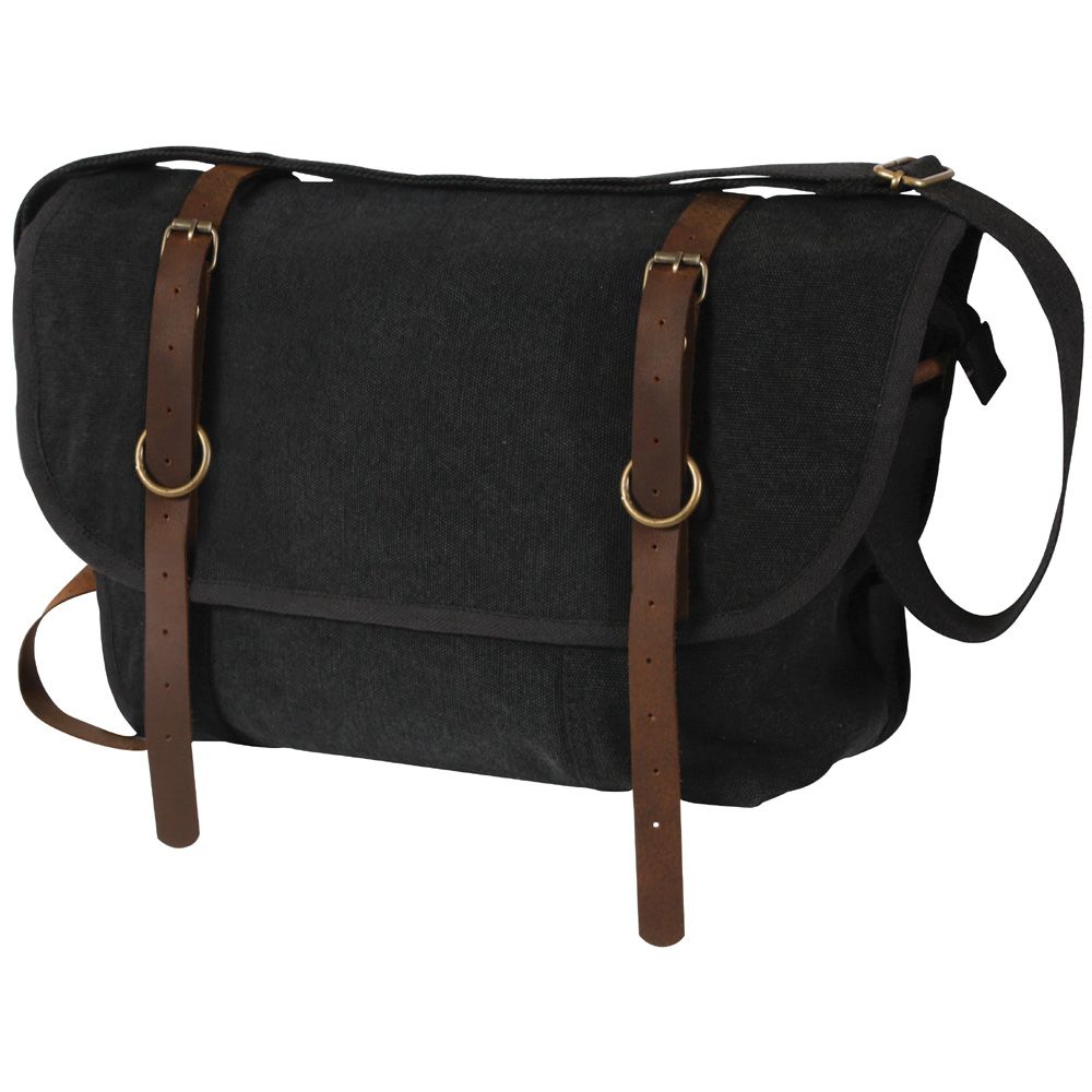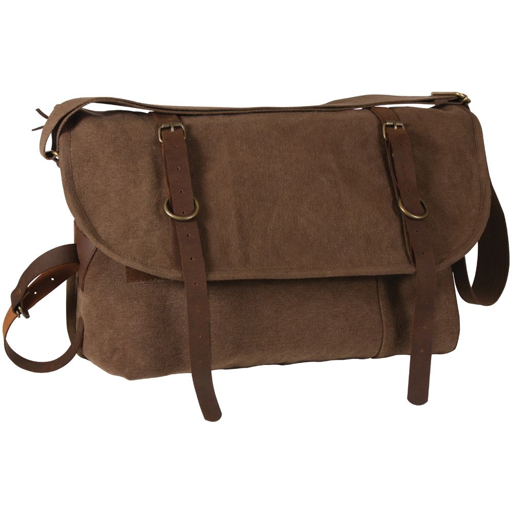 Vintage Canvas Explorer Shoulder Bag Consists Of A Large Main Compartment With 2 Small Pouches And Inner Zippered Pocket, Front Outer Pocket With Hook And Loop Closure, Front Flap With Hook And Loop Closure & Leather Strap Closure, Large Rear Zippered Pocket, Leather Zipper Pulls, And Antique Brass Hardware.