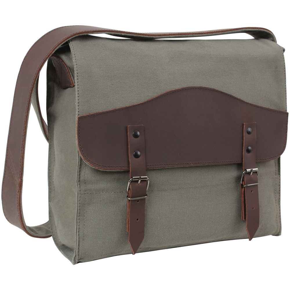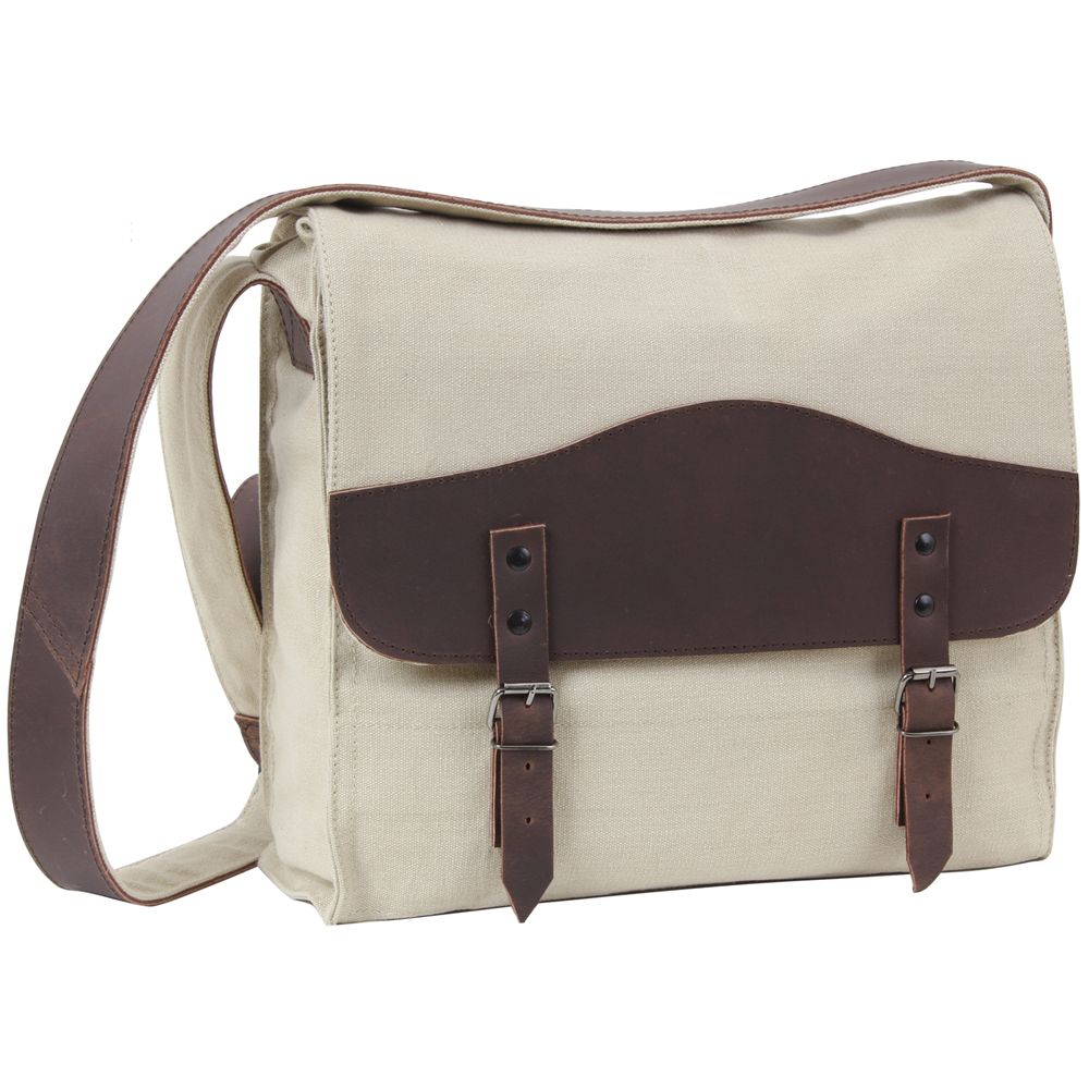 Stone Washed Cotton Canvas , Color Canvas - Khaki Or Olive Drab , No Imprint , Large Compartment With Flap , Front Flap With Leather Accent , Brown Leather Closing Straps , Adjustable Shoulder Strap With Leather , Available In Khaki Or Olive Drab , Size: 12 1/2" X 11" X 3 1/2"