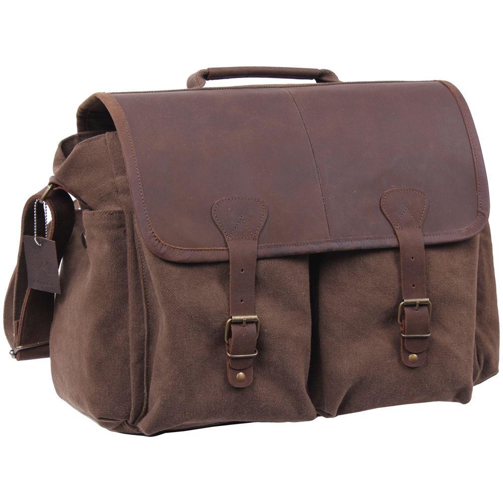 Canvas Messenger Bag with Premium Leather Front Flap features a heavyweight washed cotton canvas, large main compartment with interior zippered pocket, 2 front open top pockets, 2 side pockets with snap closures, front leather flap & strap closures, 1½" wide adjustable leather shoulder strap, leather carry handle and antique brass hardware.