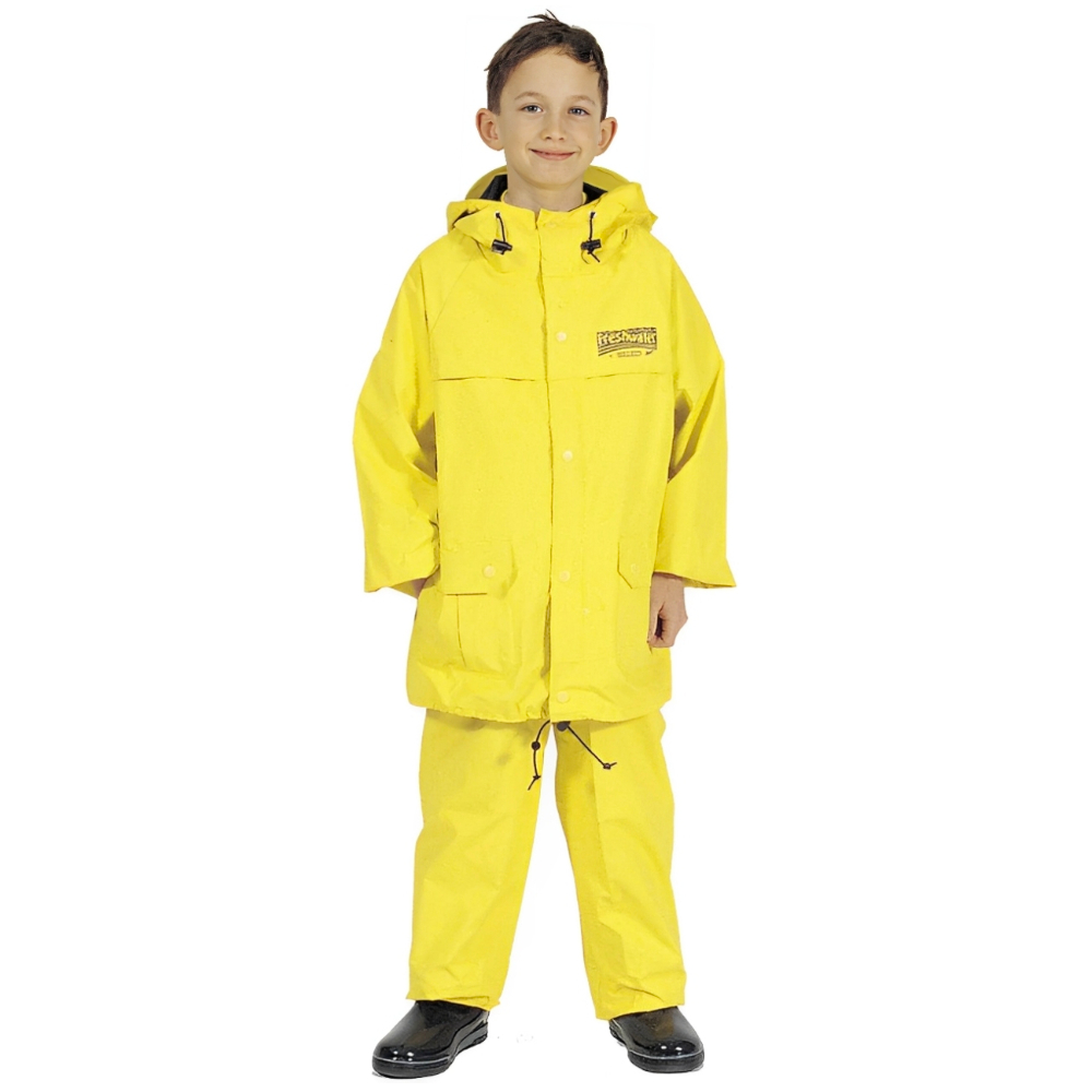No More Soaked Clothes! The WFS Wetskins Boy's Yellow Rain Suit Is Designed To Keep Your Child Fully Protected From The Rain. The Waterproof Polyester Outer With PVC Coating Effectively Repels Water, While The Zippered Front With A Snap Storm Flap Locks Out Moisture. The Billed Hood With Cord Locks Offers Adjustable Coverage, And The Reflective Tape On The Back Enhances Visibility In Foggy Or Low-Light Conditions. With Underarm Eyelets And A Ventilated Yoke, This Suit Ensures Breathability While Keeping Rain Out. The Elastic Waistband And Adjustable Ankle Snaps On The Pants Make Dressing A Breeze. Ideal For School, Hiking, Camping, And Everyday Wear!