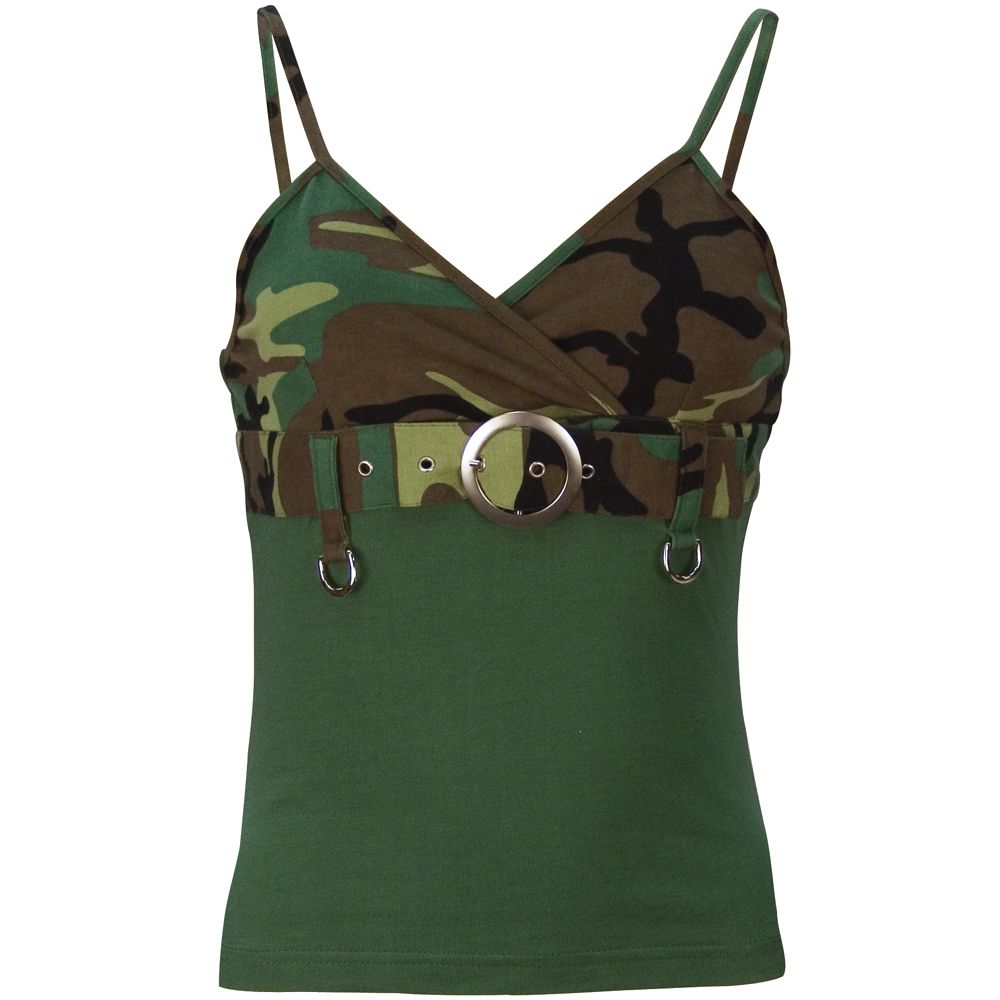This is a very comfortable tank top, ideal for warmer times. Because it is made of cotton, it offers great comfort. Although the design is very trendy, the wear is quite durable, thanks to the strong material used. There is a smart belt with buckle around the chest, along with two rings in the front, which adds to the look. The top is attached to the shoulders through straps. This spaghetti strap top primarily has a tan color, but there are also splashes of olive drab and brown on it. Together they lend it that perfect ‘camo’ look.