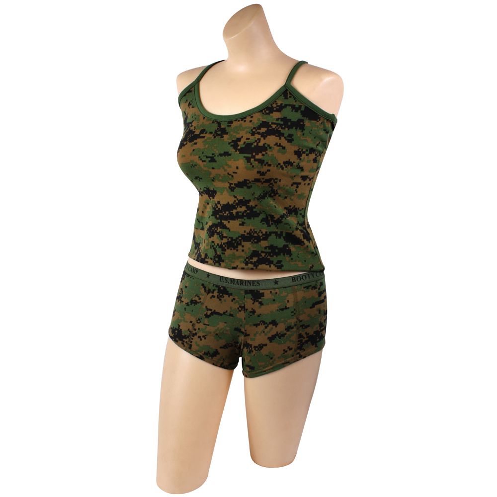 Ultra Force Womens Digital Woodland Camo Booty Shorts . This Womens Woodland Digital Camo Booty Camp’short features 90% cotton / 10%spandex , Underwear / lounging item , Elastic waistband band with booty camp printing onshorts , Booty camp lettering printed on rear of shorts.